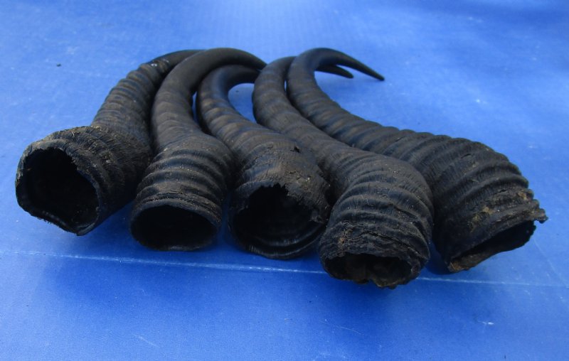 5 piece lot of authentic male springbok horns from wild African Springbok, measuring approximately 10 to 13 inches long, measured around the curve of the horn using a cloth tape measure, not straight up and down with a ruler.  Review all photos. Springbok horns are used in making furniture, cane handles and in numerous taxidermy crafts. These are real polished springbok horns and they will have natural imperfections from living in the wild and using their horns for fighting, such as tiny chips and small splits at the mouth opening, tiny cuts, scars, blemishes, etc.