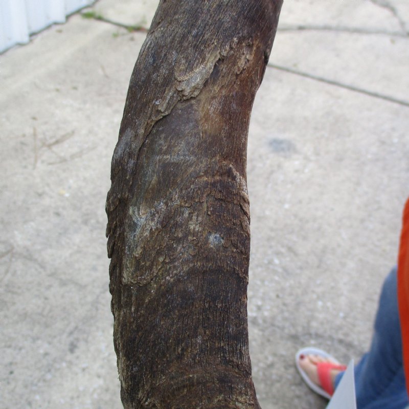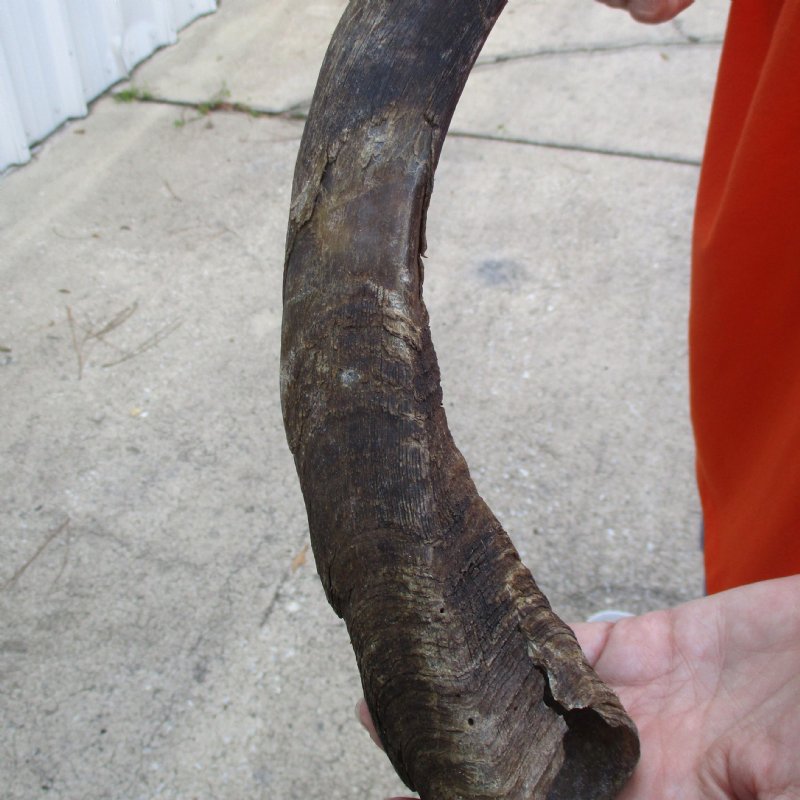 B-Grade Nyala horn for sale, (Tragelaphus angasii) imported from South Africa, measuring approximately 27 inches measured around the curl of the horn with a cloth tape measure - not straight with a wood ruler. These are B-Grade horns and will have splits, worm holes, small cracks, chips, rough patch, ect. Crack in base of horn and chunk missing from horn. - Review all photos. Nyala horns are used in making blowing horns, nyala horn instruments, furniture legs, lamps, sconces, knife handles, cane handles, inlaid crafts and numerous other taxidermy crafts.