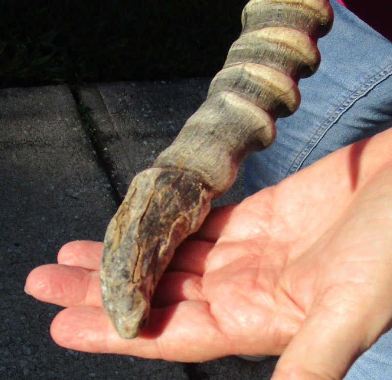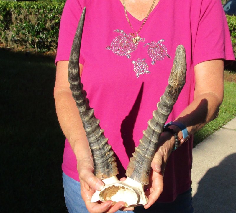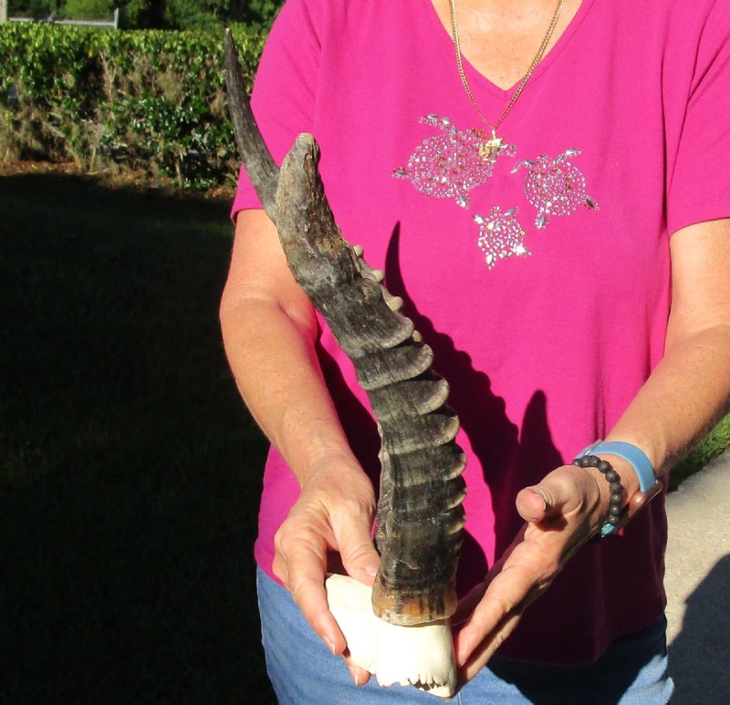 B-Grade Blesbok Skull Plate (Damaliscus dorcas phillipsi) for sale with horns measuring approximately 12 and 15 inches around the curve of the horns with a cloth tape measure - not straight up and down with a ruler. Deformed horn - Review all photos. This is a real blesbok skull with horns and will have imperfections caused by the animal living and aging in the wild.