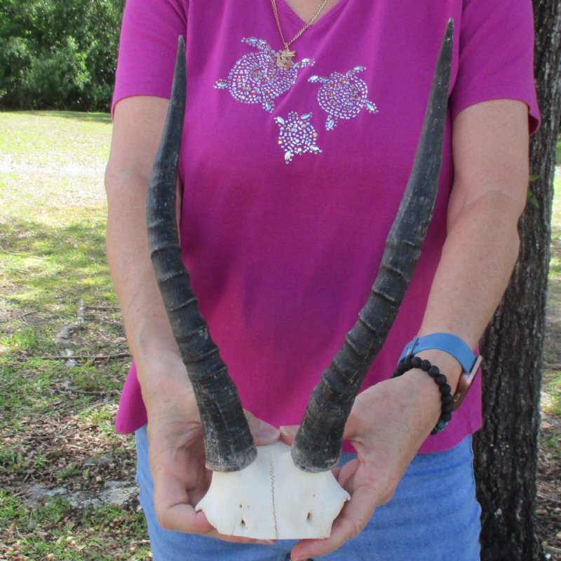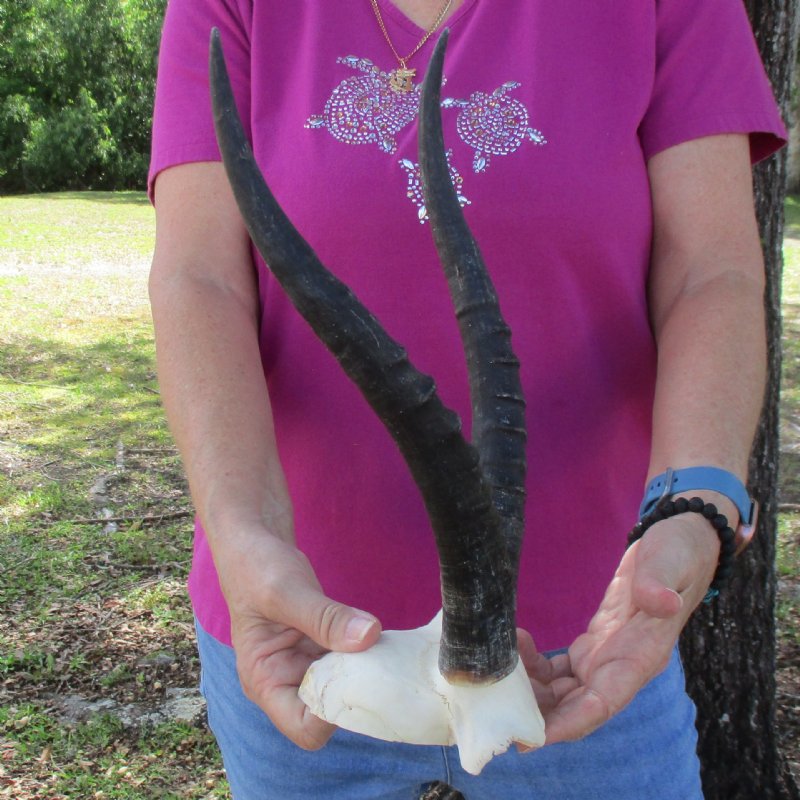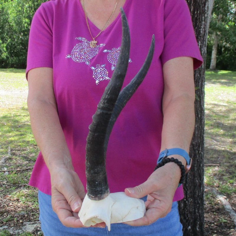 B-Grade Blesbok Skull Plate (Damaliscus dorcas phillipsi) for sale with horns measuring approximately 13 and 12 inches around the curve of the horns with a cloth tape measure - not straight up and down with a ruler. Horns are crooked - Review all photos. This is a real blesbok skull with horns and will have imperfections caused by the animal living and aging in the wild.
