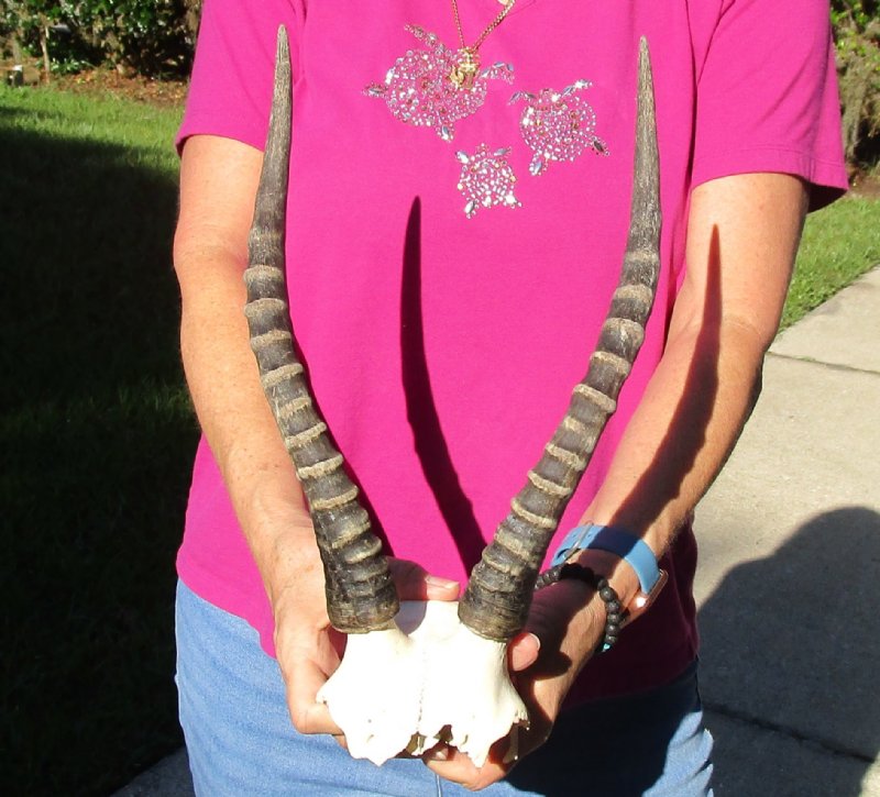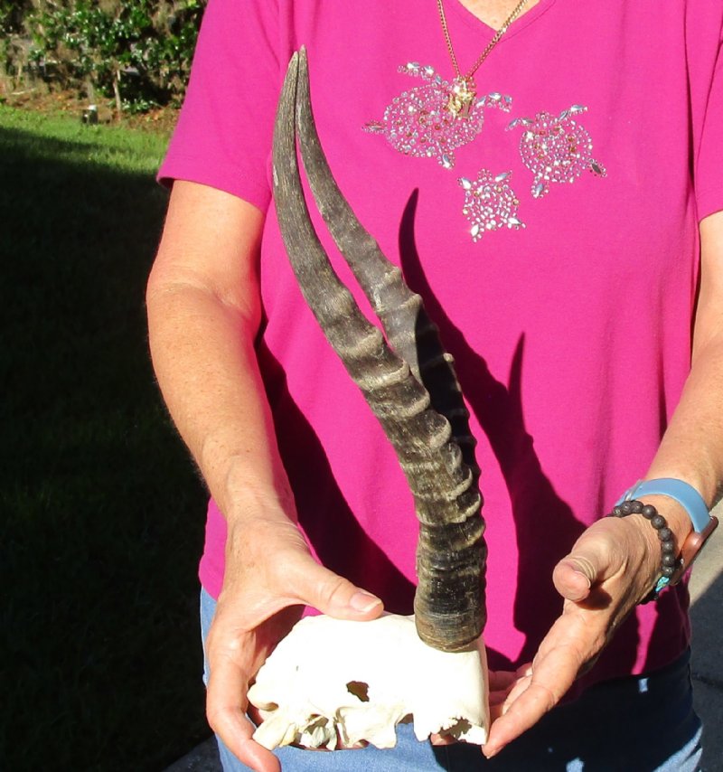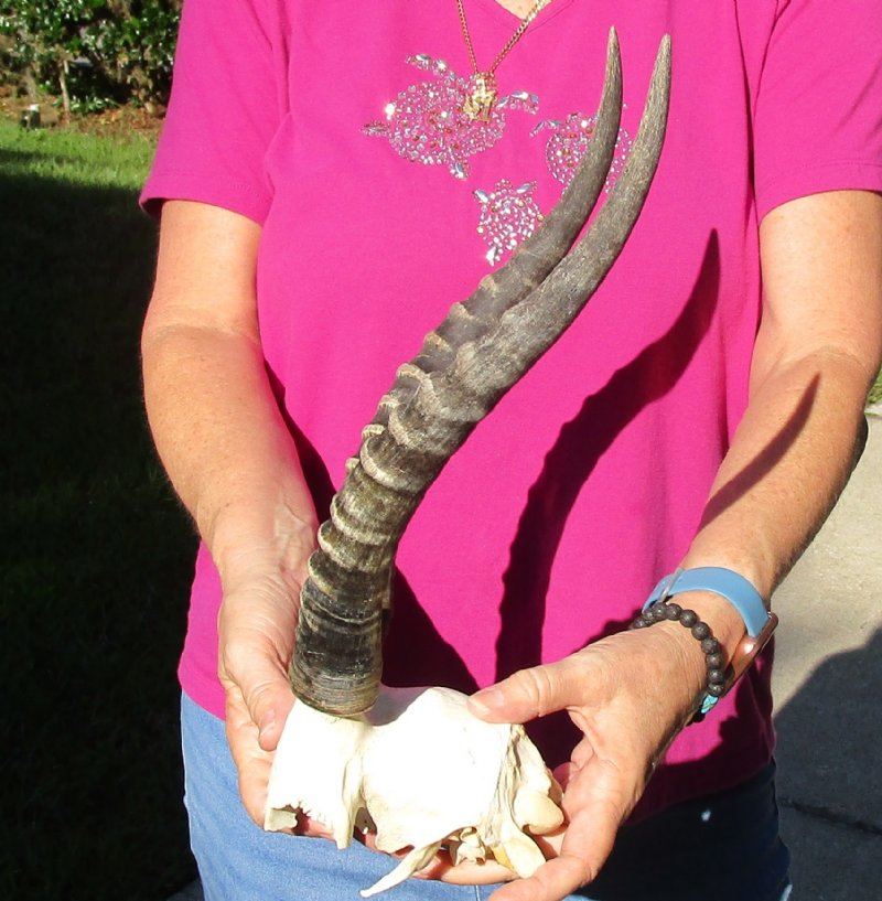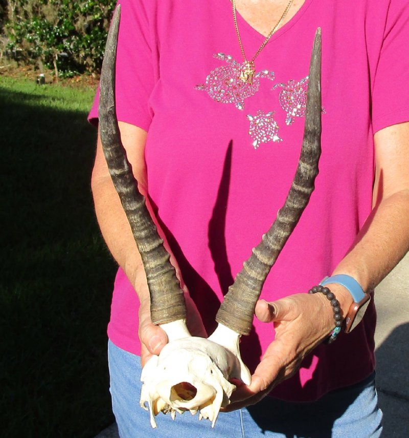 B-Grade Blesbok Skull Plate (Damaliscus dorcas phillipsi) for sale with horns measuring approximately 13 inches around the curve of the horns with a cloth tape measure - not straight up and down with a ruler. Hole in skull plate - Review all photos. This is a real blesbok skull with horns and will have imperfections caused by the animal living and aging in the wild.