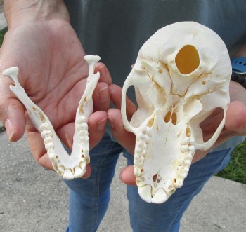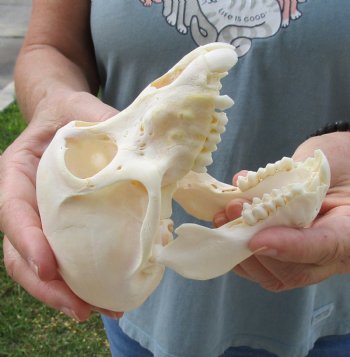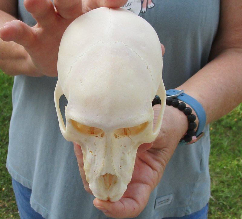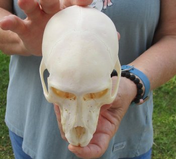 All of our baboon skulls are commercial grade and imperfect.  They will have imperfections due to the natural aging process and living in the wild--scars, blemishes, broken/missing teeth, etc.  This baboon skull was imported from South Africa and was professionally cleaned.  It has been cleared by the U.S Fish and Wildlife Services and U.S Customs Services for legal entry into the United States.