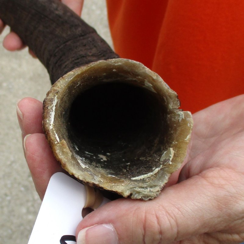 Craft-Grade Nyala horn for sale, (Tragelaphus angasii) imported from South Africa, measuring approximately 17 inches measured around the curl of the horn with a cloth tape measure - not straight with a wood ruler. These are Craft-Grade horns and will have splits, worm holes, small cracks, chips, rough patch, ect. Damage to tip of horn and metal wire around base of horn. - Review all photos. Nyala horns are used in making blowing horns, nyala horn instruments, furniture legs, lamps, sconces, knife handles, cane handles, inlaid crafts and numerous other taxidermy crafts.