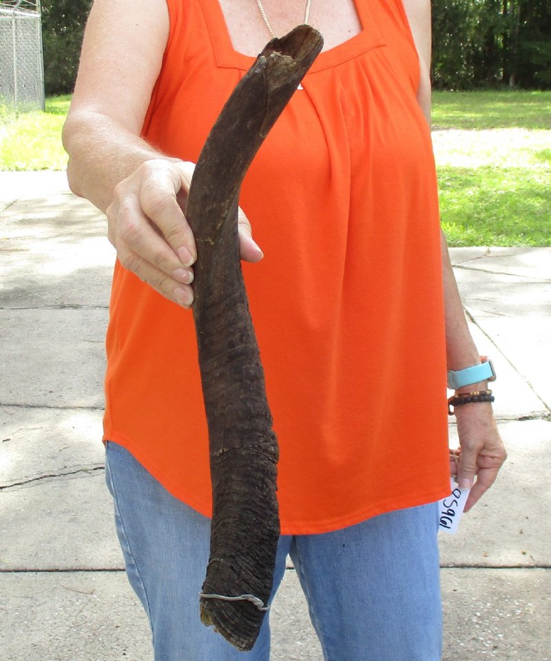 Craft-Grade Nyala horn for sale, (Tragelaphus angasii) imported from South Africa, measuring approximately 20 inches measured around the curl of the horn with a cloth tape measure - not straight with a wood ruler. These are Craft-Grade horns and will have splits, worm holes, small cracks, chips, rough patch, ect. Damage to the tip of horn and metal wiring around base of horn. - Review all photos. Nyala horns are used in making blowing horns, nyala horn instruments, furniture legs, lamps, sconces, knife handles, cane handles, inlaid crafts and numerous other taxidermy crafts.