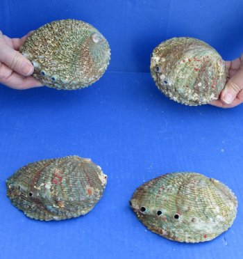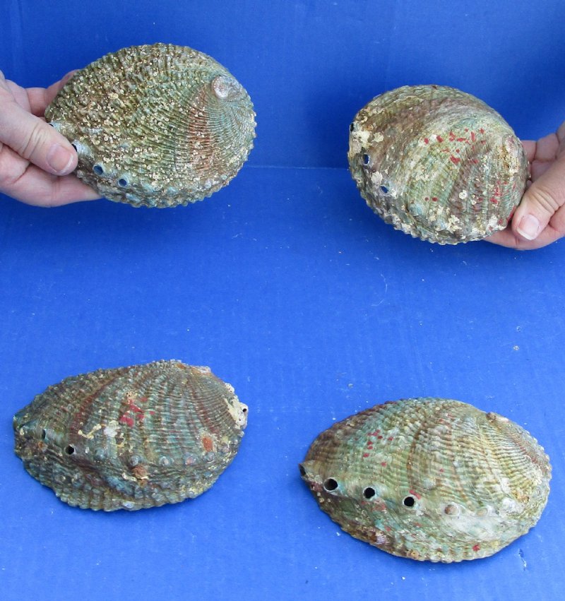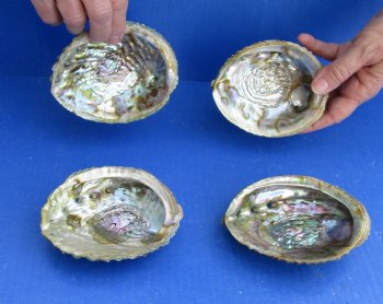 4 piece lot of Natural Pink Abalone (Haliotis corrugata) shells, commercial grade with natural imperfections. These shells measure approximately 4 to 5 inches.