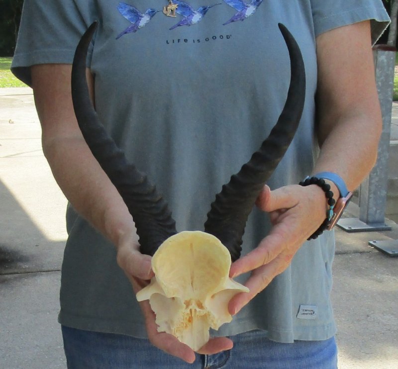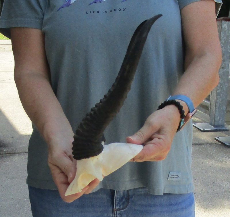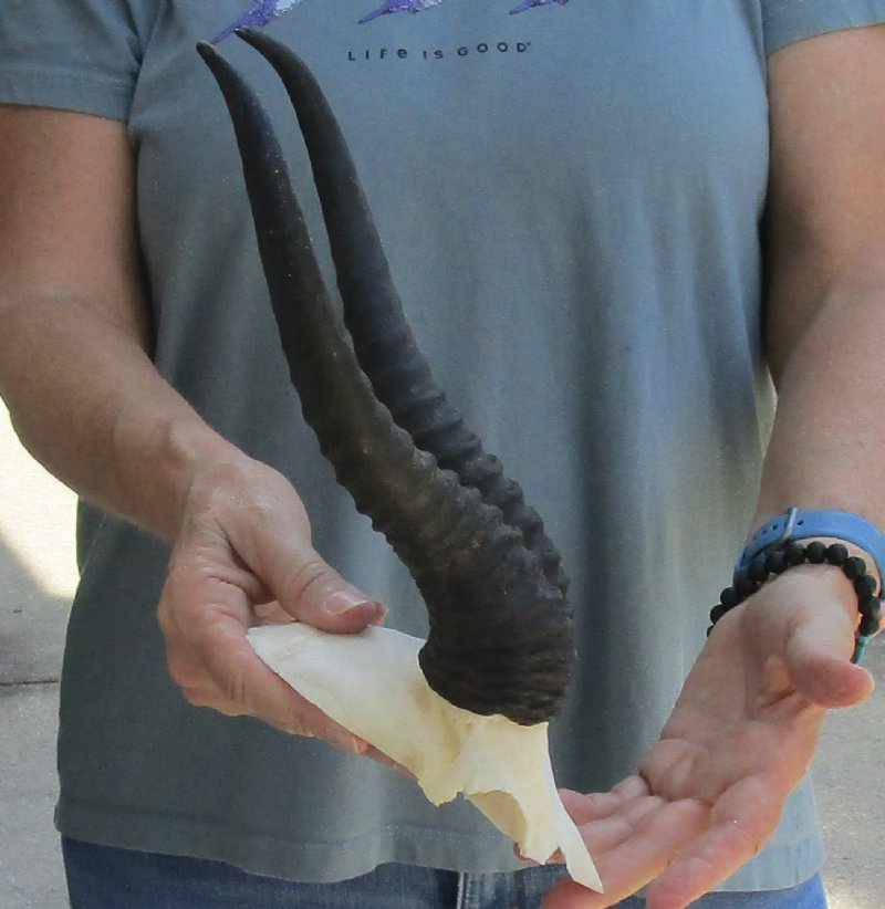 Male Springbok Skull Plate with Horns. The horns measure approximately 11 inches, measured around the curve of the horns and are on a Springbok skull plate.  Review photos.  The skull plate with horns is from a wild African Springbok and will have imperfections caused by the animal living in the wild and the natural aging process.
