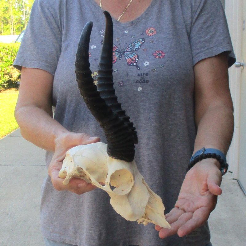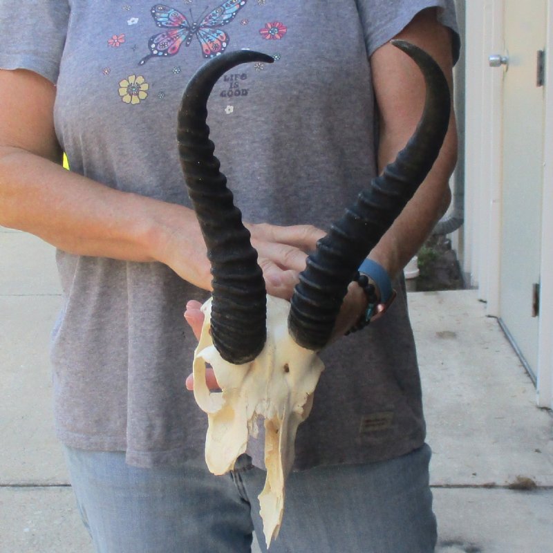 C-Grade African Male Springbok skull (Antidorcas marsupialis) with horns measuring approximately 11 & 10 1/2 inches, measured around the curl of the horns.  The skull measuring approximately 8 inches. Damage to nose, cracks, holes, parts of skull missing, and missing teethReview all photos. This springbok skull and horns is from a wild African springbok and will have imperfections caused by the animal living in the wild and the natural aging process.
