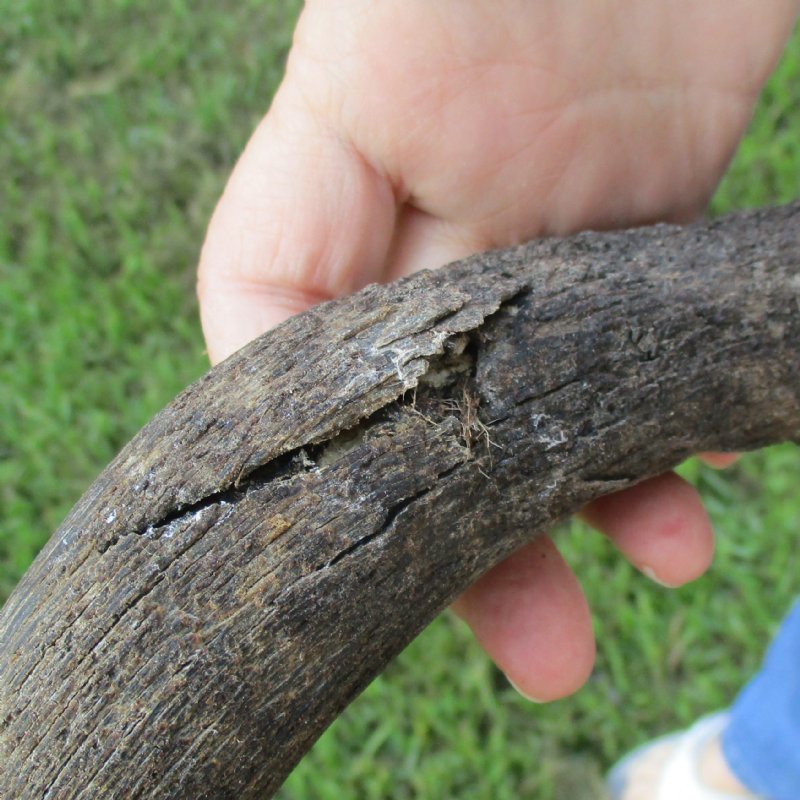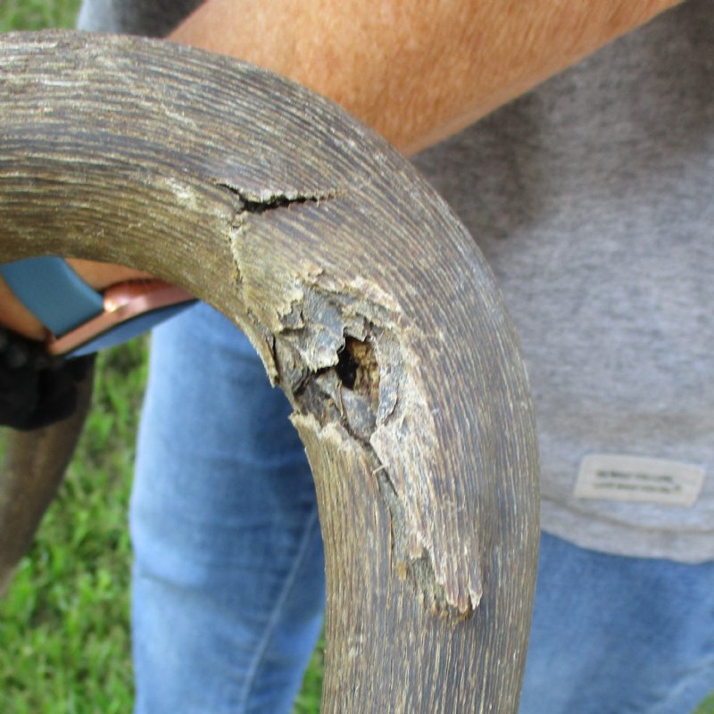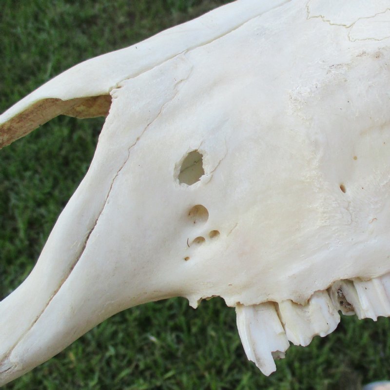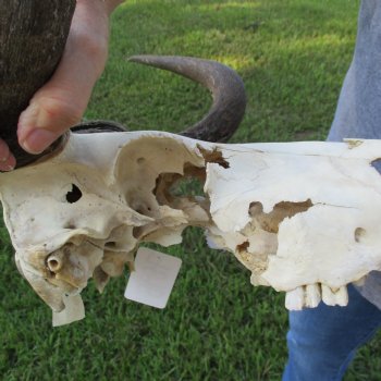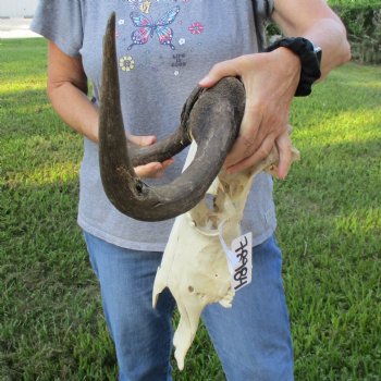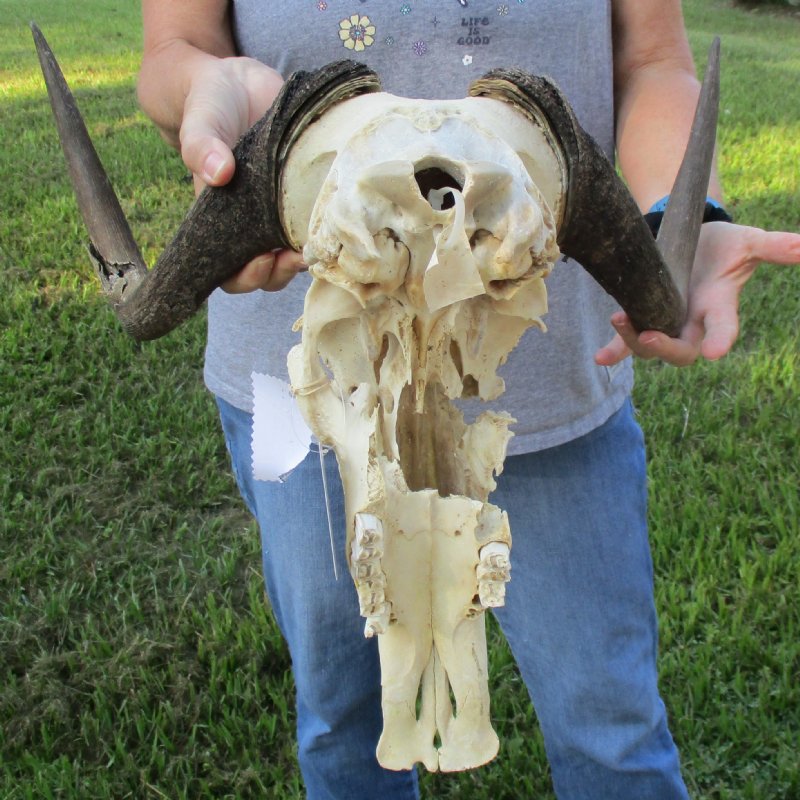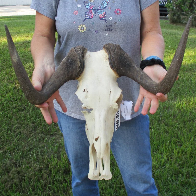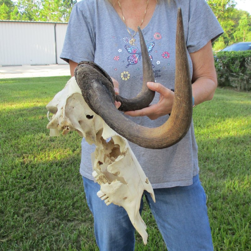 C-Grade, Female, African Black Wildebeest Skull (Connochaetes gnau) for sale. This female black wildebeest skull with horns has a horn spread of approximately 17 inches wide and the skull is approximately 16 inches long. This is a C-Grade Black Wildebeest skull - There will be holes, cracks, discoloration, missing teeth and damage throughout the skull. Horns will have cracks, fraying, bullet fragments, etc. - Review all photos carefully. This is a real black wildebeest skull with horns and will have imperfections caused by the animal living in the wild and fighting.