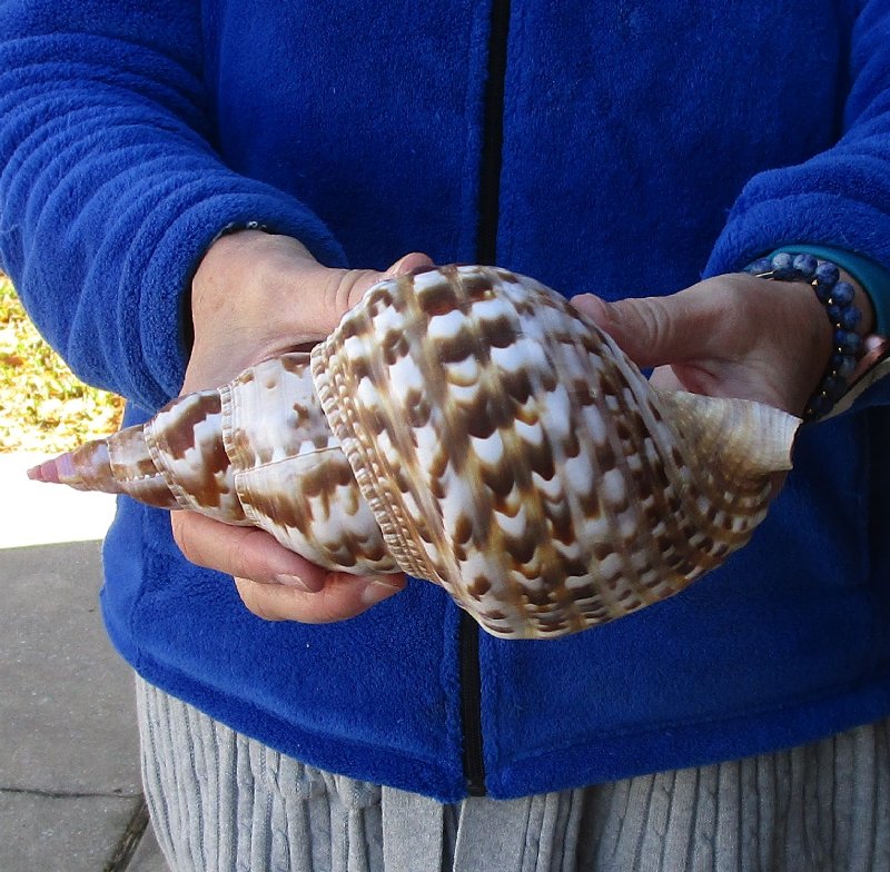 Caribbean Trumpet Triton seashell, measuring approximately 9 inches in length.    Review photos. These beautiful colorful shells are used in coastal home decorating and seashell decor. Tritons are from the family "Cymatidae". Triton seashells predominantly dwell in tropical and warm waters. Triton trumpet shells are one of the world's largest living gastropods. Their shells are mostly thick and solid.