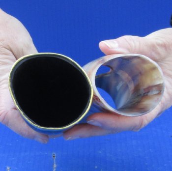 Drinking horns with Engraved Red colored Wolf Design, Brass trim, gold colored finial tip and Horn Stand (Bubalus bubalis) for sale from India measuring approximately 12 inches, measured around the curve of the horn.  They are Real -- NOT REPLICAS, and will have natural imperfections.  This Polished buffalo horns can be used for cabin decor or rustic decorating.