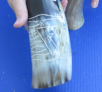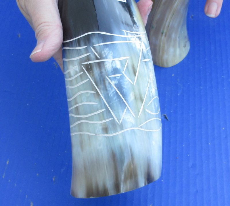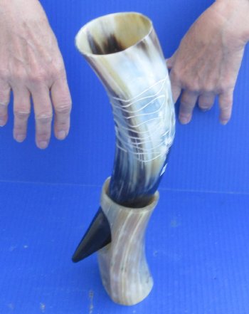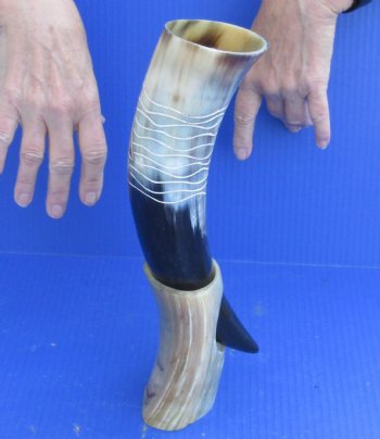 Carved Polished Buffalo (Bubalus bubalis) Drinking horn with design and Horn Stand for sale from India measuring approximately 13 inches, measured around the curve of the horn. They are Real -- NOT REPLICAS, and will have natural imperfections such as blemishes, bubbling, rough spots, small chips around mouth of horn, etc.  These polished buffalo drinking horns can be used for cabin decor.