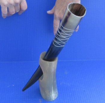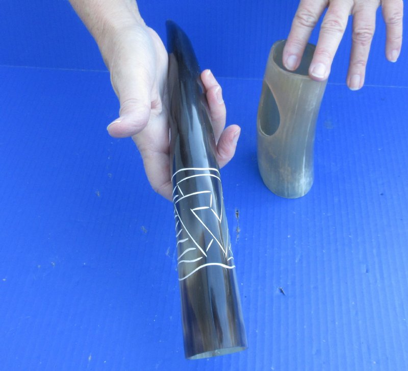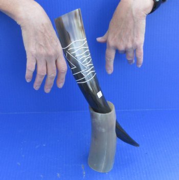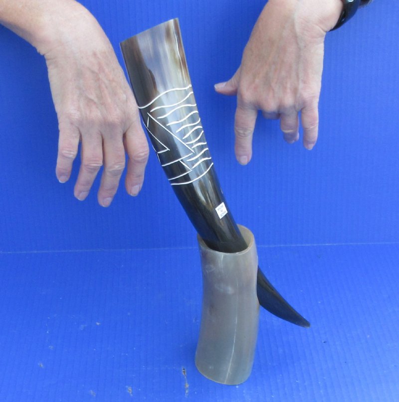 Carved Polished Buffalo (Bubalus bubalis) Drinking horn with design and Horn Stand for sale from India measuring approximately 13-1/4 inches, measured around the curve of the horn. They are Real -- NOT REPLICAS, and will have natural imperfections such as blemishes, bubbling, rough spots, small chips around mouth of horn, etc.  These polished buffalo drinking horns can be used for cabin decor.