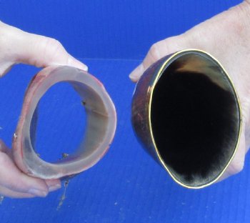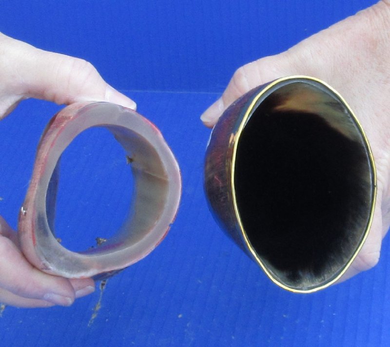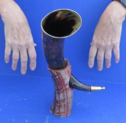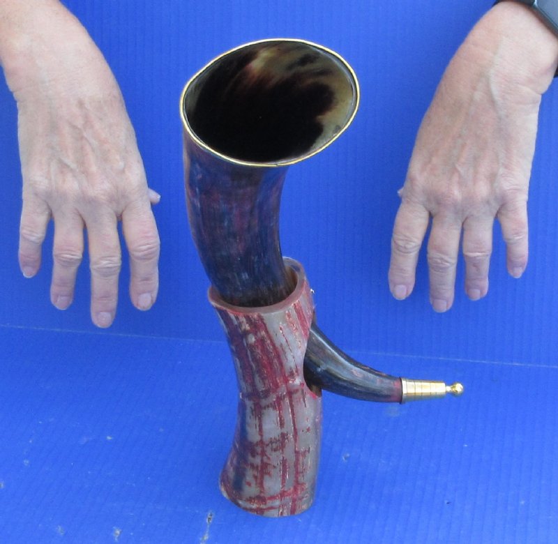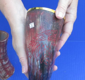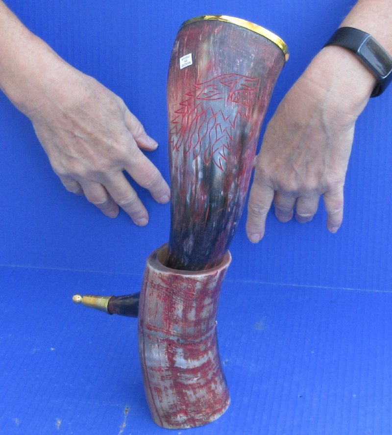 Drinking horns with Engraved Red colored Wolf Design, Brass trim, gold colored finial tip and Horn Stand (Bubalus bubalis) for sale from India measuring approximately 16 inches, measured around the curve of the horn.  They are Real -- NOT REPLICAS, and will have natural imperfections.   This Polished buffalo horns can be used for cabin decor or rustic decorating.