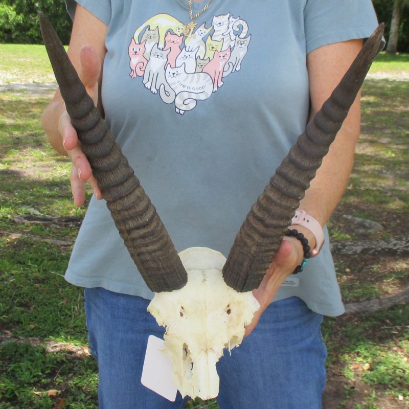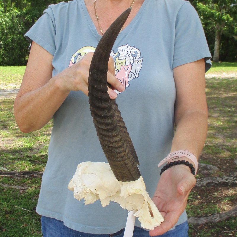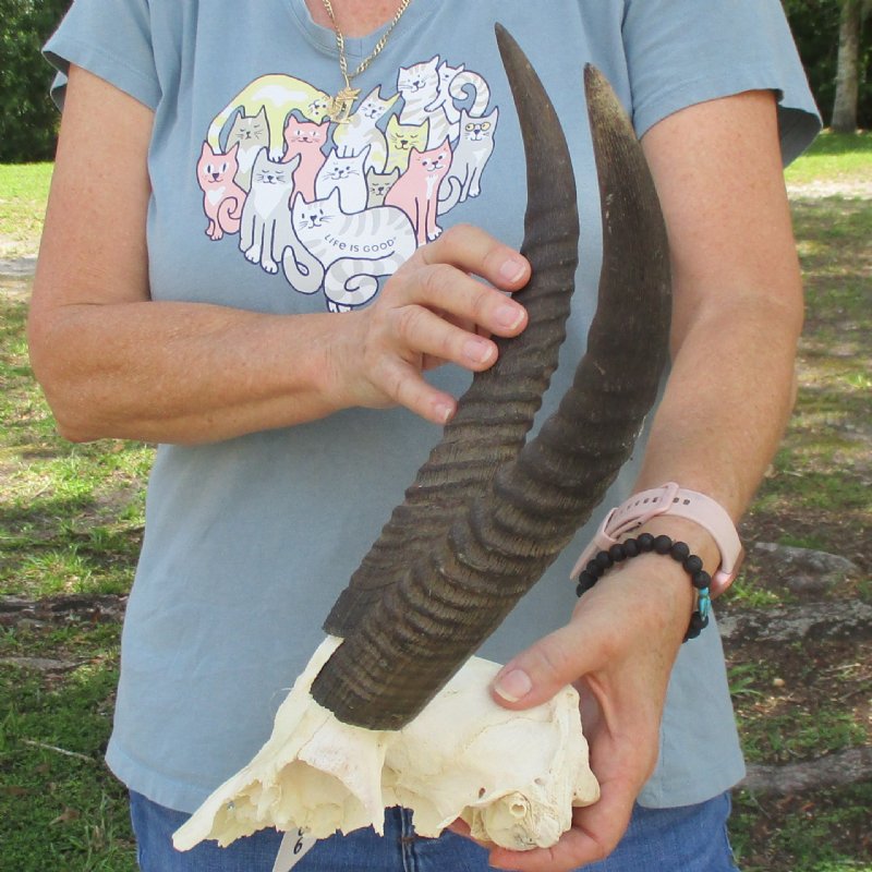 XL Common Reedbuck Skull (Redunca arundinum) with horns measuring approximately 13 & 14 inches, measured around the curl of the horns. The skull measures approximately 11 inches long. Most teeth missing - Review all photos. This Common Reedbuck skull is from a wild African Reedbuck and will have imperfections caused by the animal living in the wild and the natural aging process.