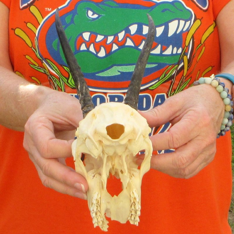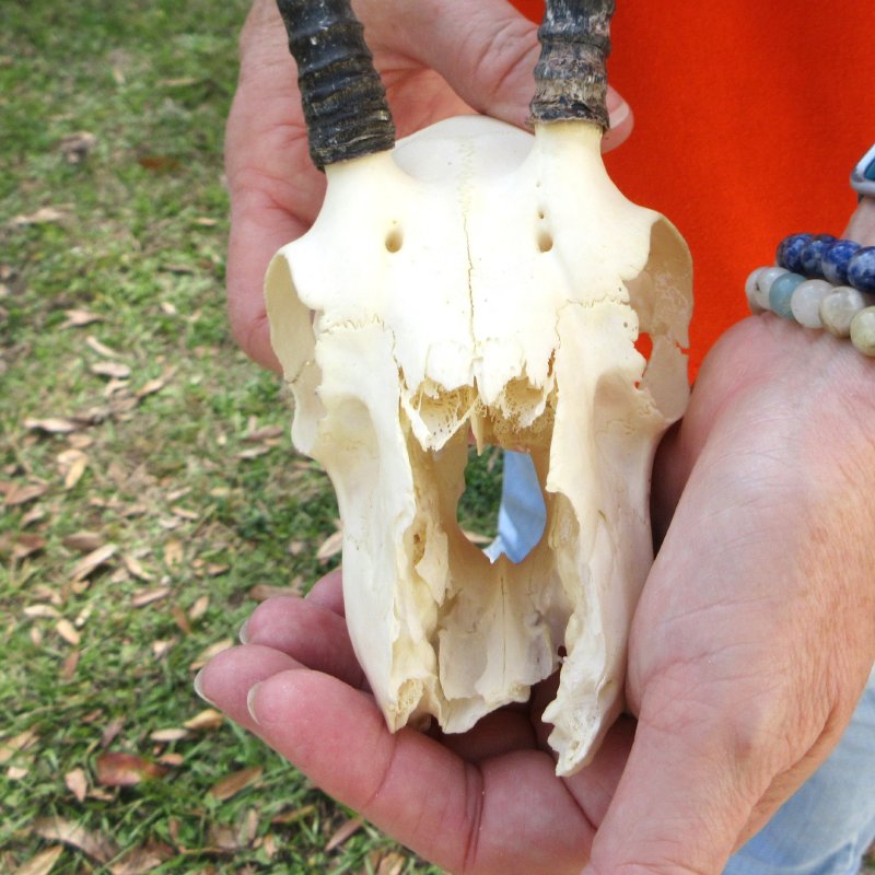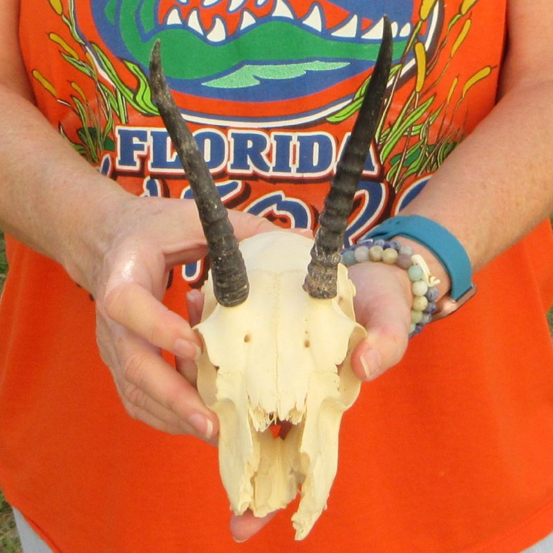 Craft Grade Female Springbok Skull (Antidorcas marsupialis) for sale with horns measuring approximately 5 inches, measured around the curl of the horns. Skull measuring approximately 6 inches. These skulls are Craft Grade quality and will have broken and missing teeth, cracks/holes/broken parts on the skulls, and cracks/fraying or drills holes on horns. Missing most of nose and mouth area, along with missing teeth.  - Review all photos. This springbok skull and horns is from a wild African springbok and will have imperfections caused by the animal living in the wild and the natural aging process.