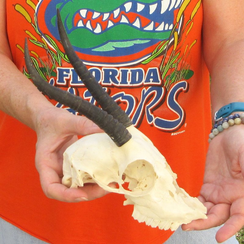 Craft Grade Female Springbok Skull (Antidorcas marsupialis) for sale with horns measuring approximately 7 inches, measured around the curl of the horns. Skull measuring approximately 7 inches. These skulls are Craft Grade quality and will have broken and missing teeth, cracks/holes/broken parts on the skulls, and cracks/fraying or drills holes on horns. Missing teeth, holes, missing all of nose area, and missing part of mouth.   - Review all photos. This springbok skull and horns is from a wild African springbok and will have imperfections caused by the animal living in the wild and the natural aging process.