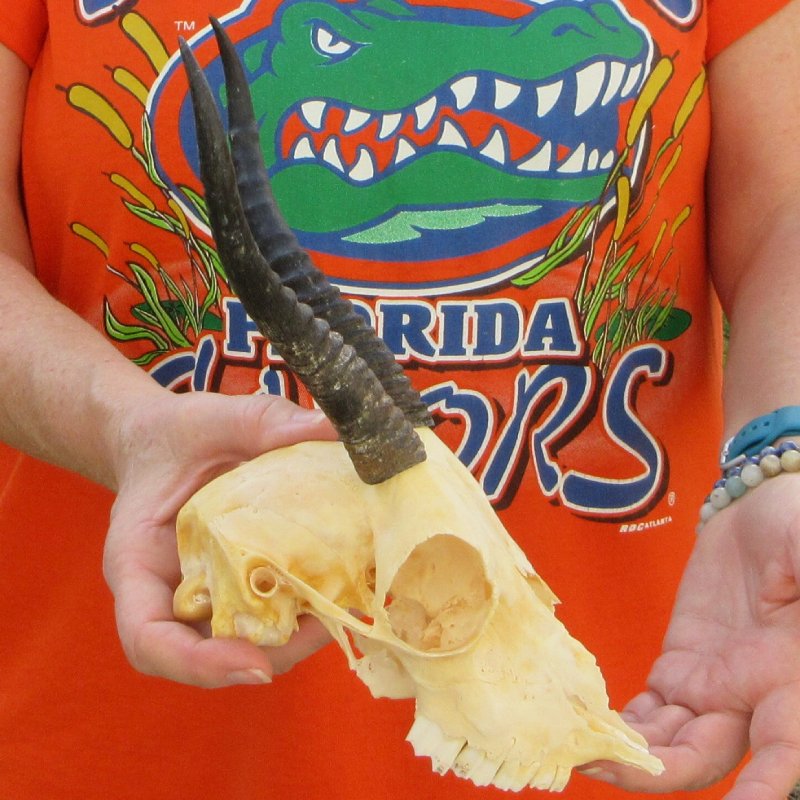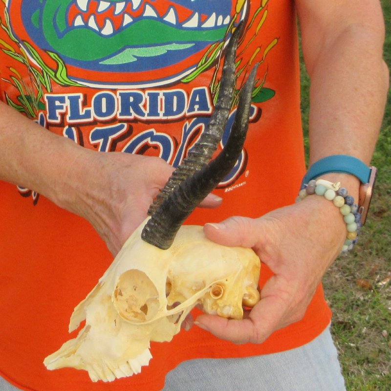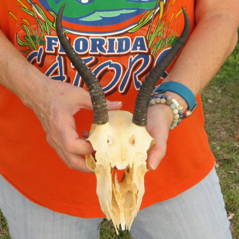 Craft Grade Female Springbok Skull (Antidorcas marsupialis) for sale with horns measuring approximately 7 inches, measured around the curl of the horns. Skull measuring approximately 7 inches. These skulls are Craft Grade quality and will have broken and missing teeth, cracks/holes/broken parts on the skulls, and cracks/fraying or drills holes on horns. Missing teeth, holes, missing all of nose area, discoloration, and missing part of mouth.   - Review all photos. This springbok skull and horns is from a wild African springbok and will have imperfections caused by the animal living in the wild and the natural aging process.