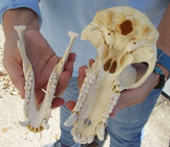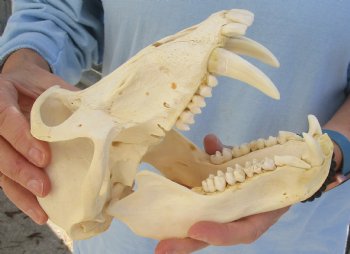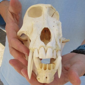 All of our baboon skulls are commercial grade and imperfect.  They will have imperfections due to the natural aging process and living in the wild--scars, blemishes, broken/missing teeth, etc.  This baboon skull was professionally cleaned and cleared by the U.S Fish and Wildlife Services and U.S Customs Services for legal entry into the United States.