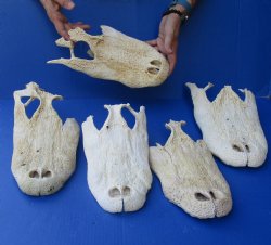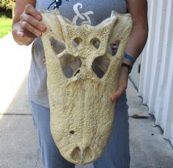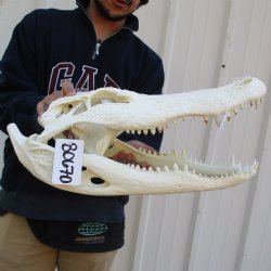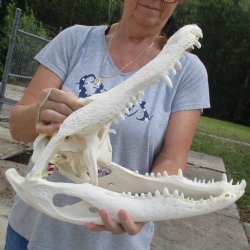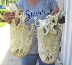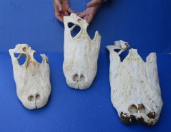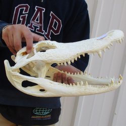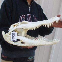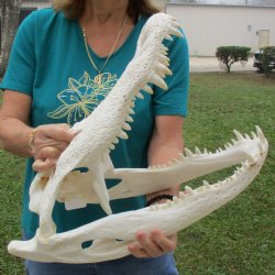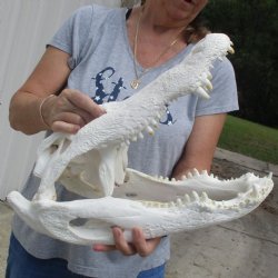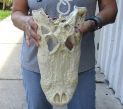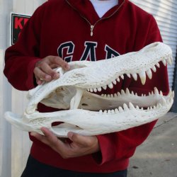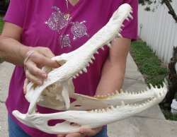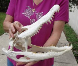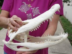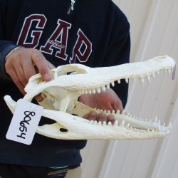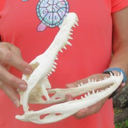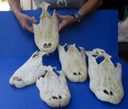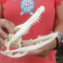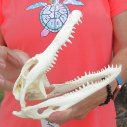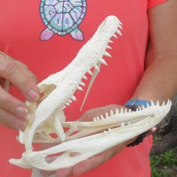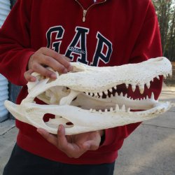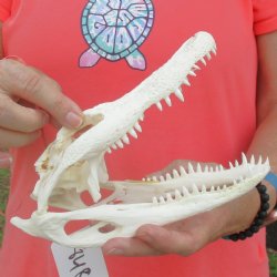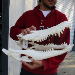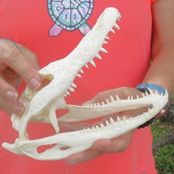 B-Grade, Discounted Beetle-Cleaned Florida Alligator Skulls (Alligator mississippiensis) for sale. These are real gator skulls - NOT replicas, and will have some natural blemishes and chipped or missing teeth from living in the wild and fighting. These Discounted Skulls may have holes, cracks, discoloration, etc. The cleaning process causes all the teeth to come out and the skull to separate. The skull has been glued back together, however the teeth will not be in their original place and will not be their original teeth. Alligators have between 74 and 80 teeth in their mouth at a time. As teeth wear down they are replaced. An alligator can go through 2,000 to 3,000 teeth in a lifetime. These wholesale alligator skulls are a profitable retail product for beach shops and souvenir and gifts stores catering to gator football fans, tourists, reptile collectors, teachers, students, and collectors of unusual items.