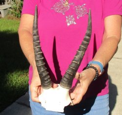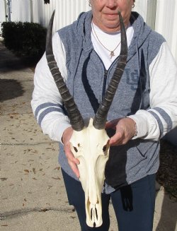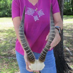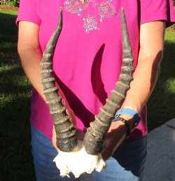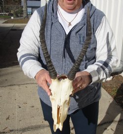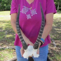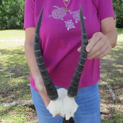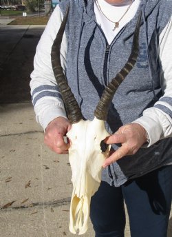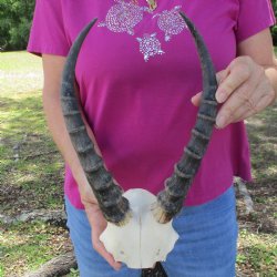 Shop our discounted B-Grade and Craft Grade Blesbok (Damaliscus dorcas phillipsi) and Bushbuck (Tragelaphus scriptus) Skull with horns and Skull Plates all hand picked and photographed allowing you to buy what you see. The horns are measured around the curve of the horns using a cloth tape measure -- NOT straight with a wood ruler. These are B and Craft Grade skulls and skull plates and will have damage - Damage or missing nose, missing teeth, holes, broken or chipped horn, damage to eye sockets, cracks, worm holes, drill holes and may be discolored - Review all the photos. All of our animal products are by-products of the African Government's culling program and farming industry. All products were professionally cleaned and/or professionally tanned in South Africa and cleared by the U.S. Fish and Wildlife Services and U.S. Customs Services for legal entry into the United States.