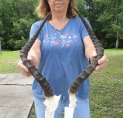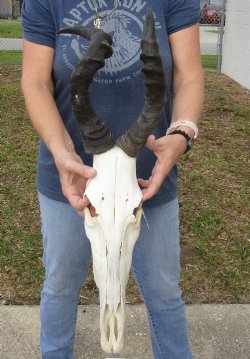 Shop our discounted B-Grade and Craft Grade Hartebeest (Alcelaphus buselaphus) Skulls with horns and Skull Plates measuring approximately 12 inches up to 16 inches, all hand picked and photographed allowing you to buy what you see. The horns are measured around the curve of the horns using a cloth tape measure -- NOT straight with a wood ruler. These are B and Craft Grade skulls and skull plates and will have damage - Damage or missing nose, missing teeth, holes, broken or chipped horn, damage to eye sockets, cracks, worm holes, drill holes and may be discolored - Review all the photos. All of our animal products are by-products of the African Government's culling program and farming industry. All products were professionally cleaned and/or professionally tanned in South Africa and cleared by the U.S. Fish and Wildlife Services and U.S. Customs Services for legal entry into the United States.
