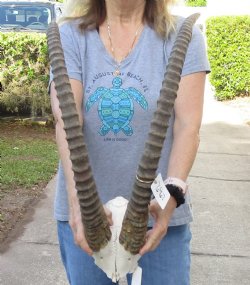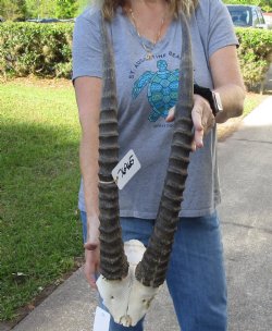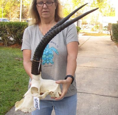 B and C Grade African Sable skull with horns and skull plates (Hippotragus niger) and B and C Grade African Roan Skull with horns and skull plates (Hippotragus equinus) for cabin decor and African themed decor. The horns are measured around the curve of the horns using a cloth tape measure--NOT straight with a wood ruler. The horns come off for shipping purposes. These are B and C grade skulls and skull plates and will have damage - Damage or missing nose, missing teeth, holes, broken or chipped horn, damage to eye sockets, crack, worm holes, drill holes any may have some sort of discoloration - Review all the photos. All of our animal products are by-products of the African Government's culling program and farming industry. All products were professionally cleaned and/or professionally tanned in South Africa and cleared by the U.S. Fish and Wildlife Services and U.S. Customs Services for legal entry into the United States.