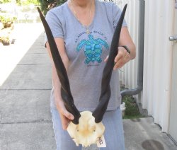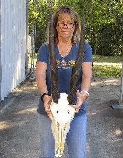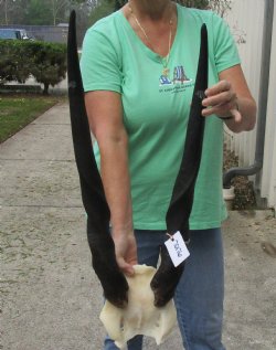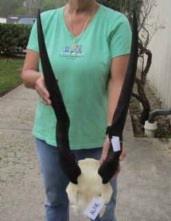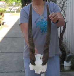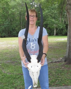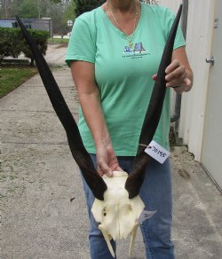 Female Eland Skull with Horns and Male African Eland Skulls with horns 24 to 31 inches, hand picked and photographed are perfect for African themed decorating, hunting lodge decor and rustic cabin decor.  The common eland, (Taurotragus oryx) also known as the southern eland or eland antelope, is a arge sized savannah and plains antelope found in East and Southern Africa. Carefully review all photos of the male eland skulls and female eland skulls and choose the best one for your project or to display.  Each female eland skull and male eland skull with horns is a by-product of the African Government's culling program and farming industry. All products were professional cleaned and/or professionally tanned in South Africa and cleared by the U. S. Fish and Wildlife Services and U.S. Customs Services for legal entry into the United States.