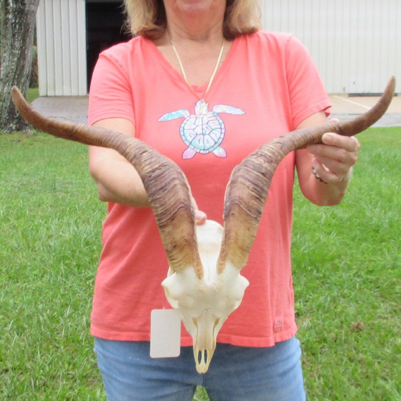 Extra Large African Domesticated Goat Skull with approximately 21 inch horns (measured around the curve of the horn with a cloth tape measure) and an estimated 9-1/2 x 5-1/4 inch long skull.   - Review all photos. This is a domesticated African goat and will have imperfections due to the natural aging process and fighting and living -- scars, blemishes, rub areas, broken teeth, etc. All our goat skulls with horns are by-products of the African Government's culling program and farming industry. All products were professional cleaned and/or professionally tanned in South Africa and cleared by the U. S. Fish and Wildlife Services and U.S. Customs Services for legal entry into the United States.