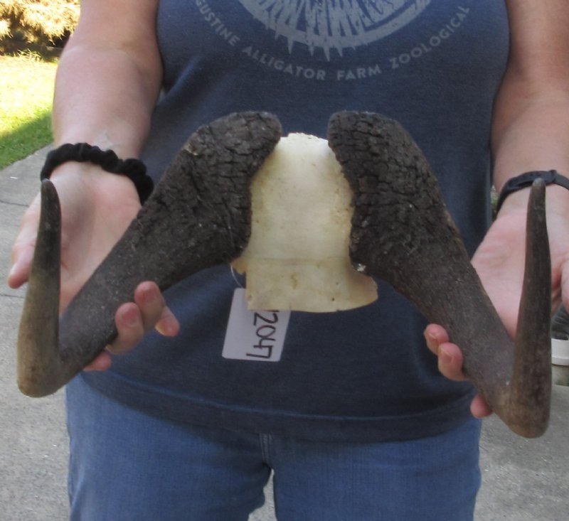 B-Grade Female African black wildebeest skull plate with horns for cabin decor and lodge decorWorm hole in one horn - review photos  This black wildebeest skull plate has horns approximately 14 inches wide.
