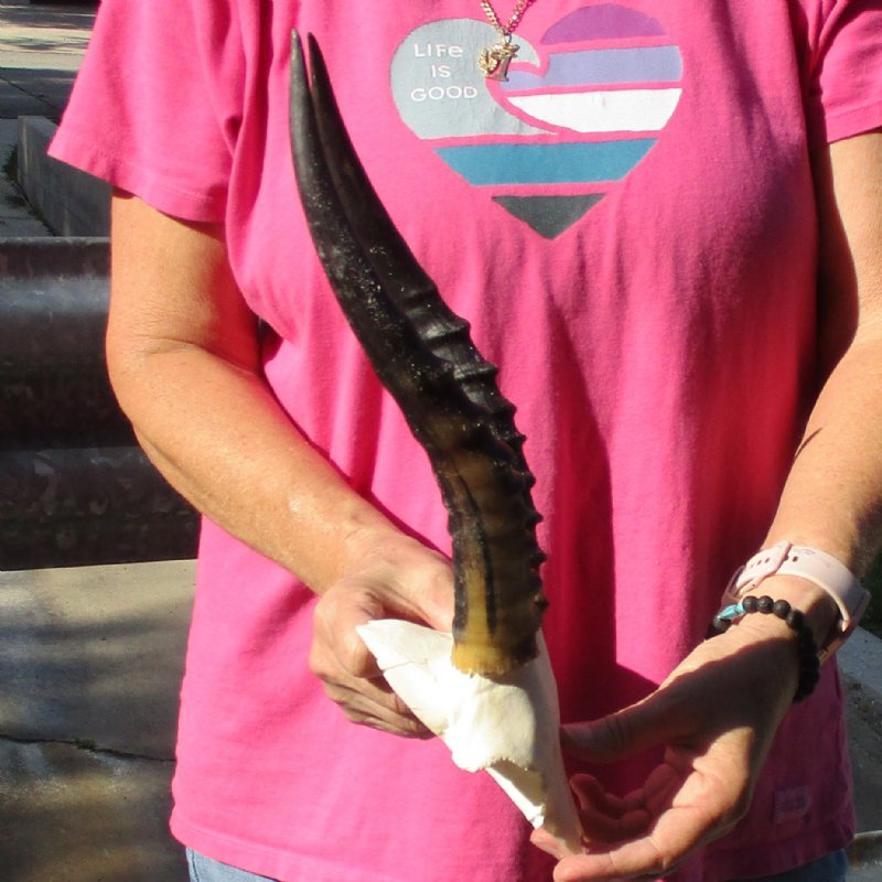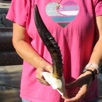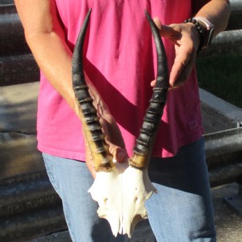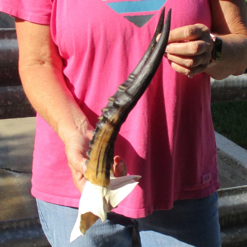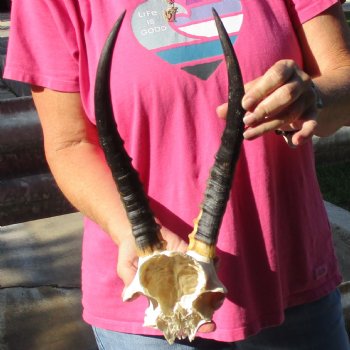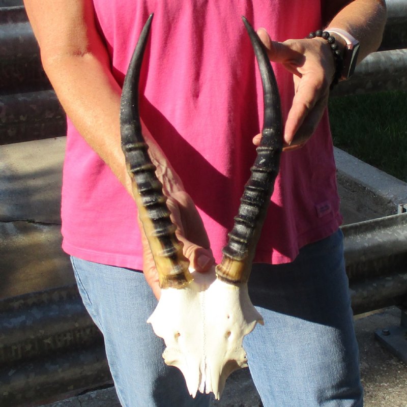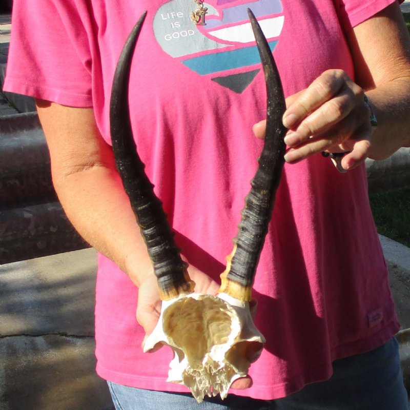 Female Blesbok Skull Plate (Damaliscus dorcas phillipsi) for sale with horns measuring approximately 11 inches around the curve of the horns - not straight with a wood ruler.  - Review all photos. This is a real blesbok skull with horns and will have imperfections caused by the animal living and aging in the wild.