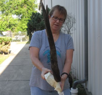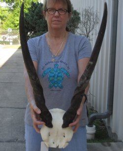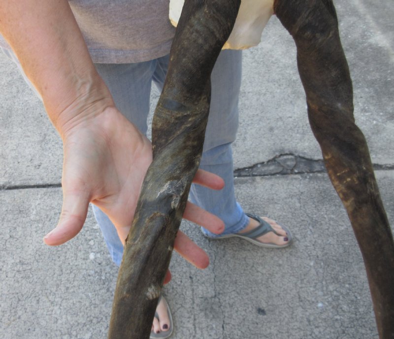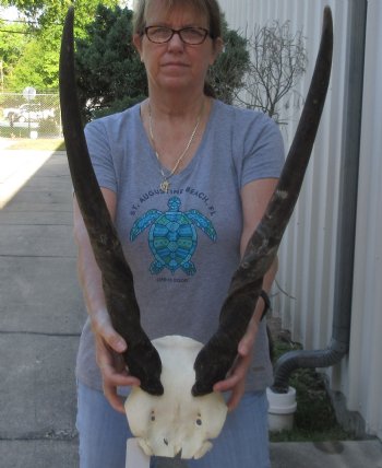 Female Eland (Taurotragus oryx) Skull Plate with 28 inch Horns for rustic cabin decor, measured around the curve of the horn. For rustic cabin decor.   This skull plate has rough horns - Review photos. This Eland skull plate was imported from South Africa and obtained from the African government's culling program and the farming industry. Eland skulls are used in cabin and hunting lodge decorating as wall mounts over fireplaces and as wall accents. We are direct importers of African animal skulls and horns and animal products.
