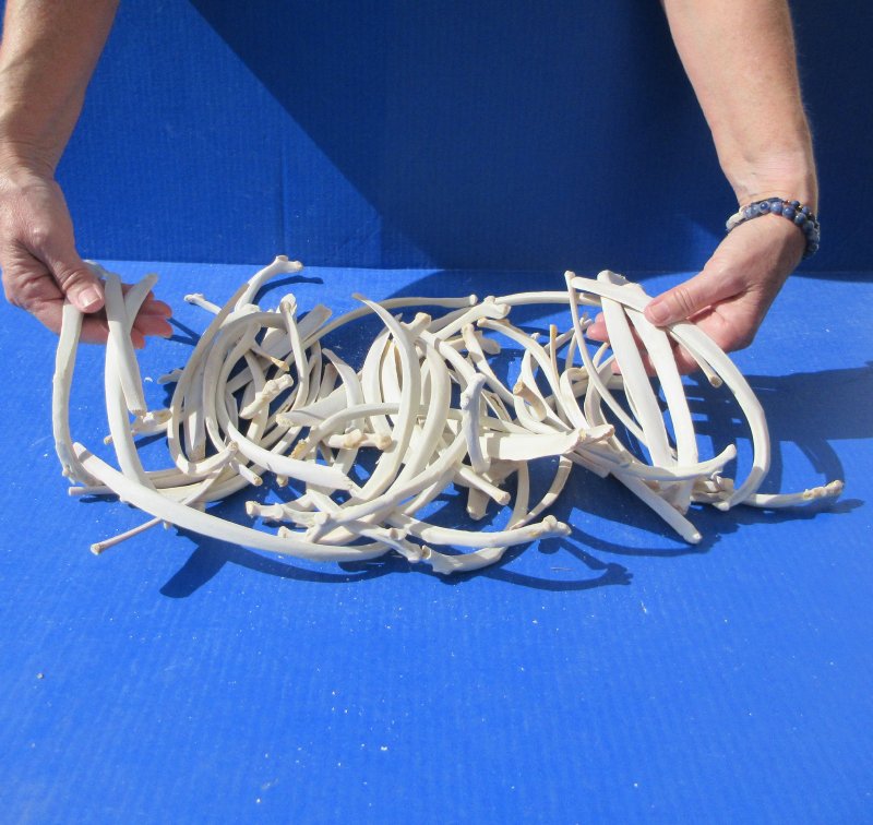 50 piece lot of Wild Boar and Deer Ribs for sale, with natural imperfections, measuring approximately 9 to 12 inches long. - Review photos. These wild boar rib bones have been cleaned and whitened; however, they will have natural imperfections and may have some dried cartilage on the ends of the bones. Some may have chipped edges, are flaky and have some discoloration, and will vary in size and shape.
