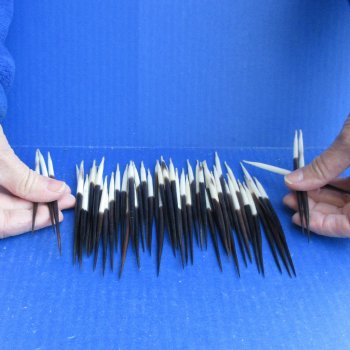 50 thick/fat African porcupine quills (Hystrix africaeaustralis) measuring approximately 4 to 6 inches long.  These are good clean quillsThe bundle may contain a few quills either below or above the size range you ordered.  The thickness will vary within the bundle also. African Porcupine quills are used in American Indian crafts. Quillwork is perhaps the oldest form of embroidery used by Native Americans. Quills were folded, twisted, wrapped, plaited and sewn using a wide range of techniques to decorate articles of clothing, bags, knife sheaths, baskets, wooden handles and pipe stems. Quillwork has been, and continues to be used to decorate the basketry of various Native American tribes.