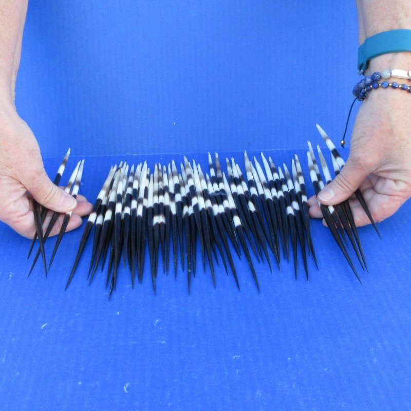 50 thick/fat African porcupine quills (Hystrix africaeaustralis) measuring approximately 7 to 8 inches long.  These are good clean quillsThe bundle may contain a few quills either below or above the size range you ordered.  The thickness will vary within the bundle also. African Porcupine quills are used in American Indian crafts. Quillwork is perhaps the oldest form of embroidery used by Native Americans. Quills were folded, twisted, wrapped, plaited and sewn using a wide range of techniques to decorate articles of clothing, bags, knife sheaths, baskets, wooden handles and pipe stems. Quillwork has been, and continues to be used to decorate the basketry of various Native American tribes.