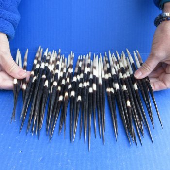 50 thick/fat African porcupine quills (Hystrix africaeaustralis) measuring approximately 8-1/2 to 9-1/2 inches long.  These are good clean quillsThe bundle may contain a few quills either below or above the size range you ordered.  The thickness will vary within the bundle also. African Porcupine quills are used in American Indian crafts. Quillwork is perhaps the oldest form of embroidery used by Native Americans. Quills were folded, twisted, wrapped, plaited and sewn using a wide range of techniques to decorate articles of clothing, bags, knife sheaths, baskets, wooden handles and pipe stems. Quillwork has been, and continues to be used to decorate the basketry of various Native American tribes.