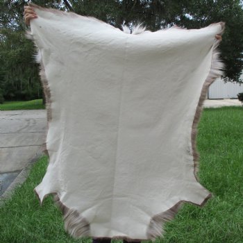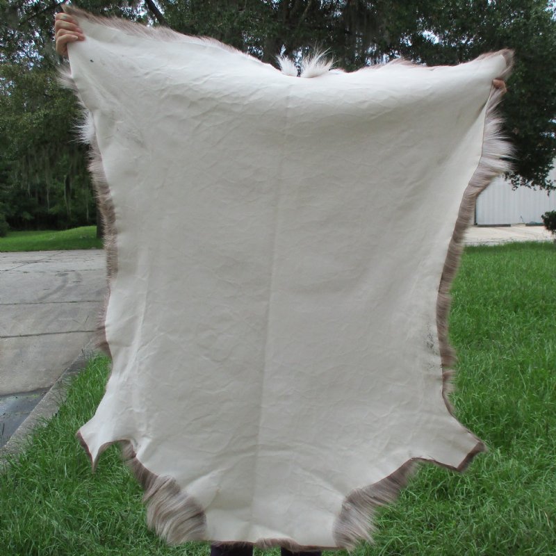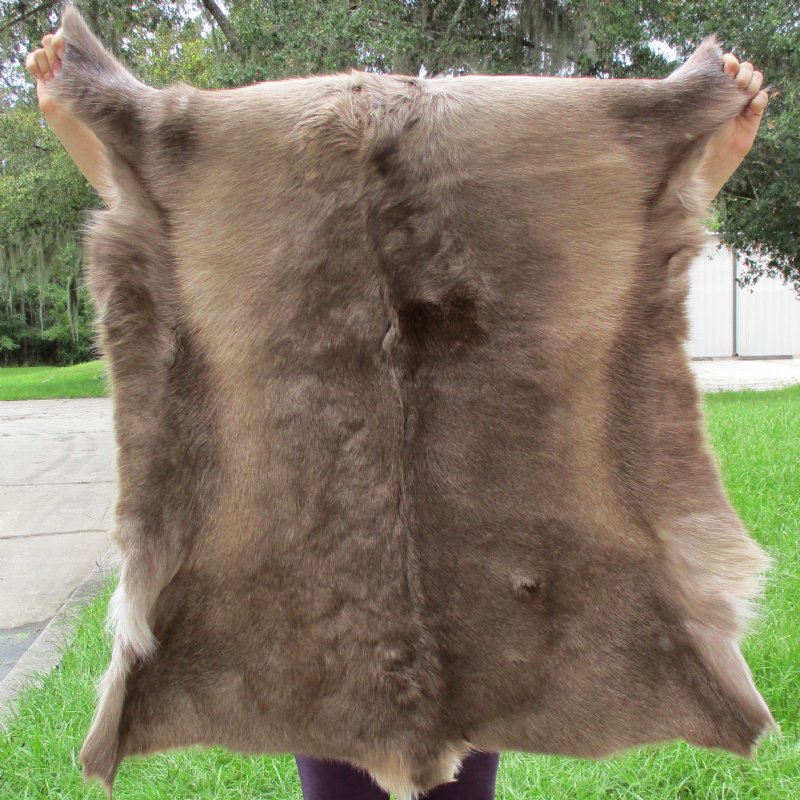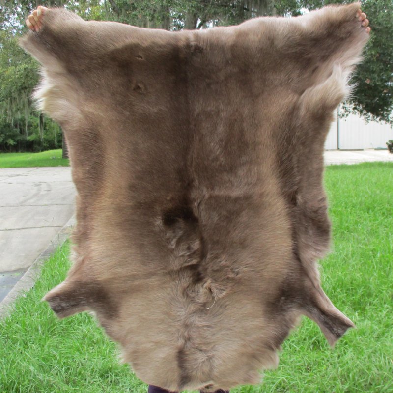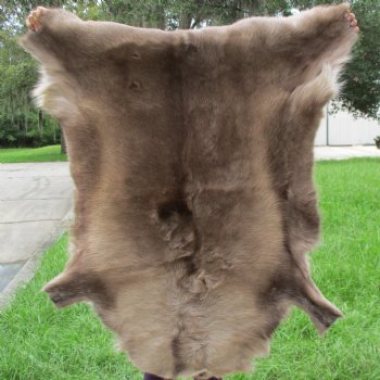 Reindeer (Rangifer Tarandus) with legs, farm raised, and imported from Finland measuring approximately 43 inches long by 39 inches wide. Review all photos. Reindeer hides are a natural and comfortable product. Reindeer skins look great as wall decoration in a cabin or den, as furniture throws or decorative rugs but should not be walked or stepped on, to prevent shedding and breaking of the fur. Reindeer skins and hides should be cleaned once a year with a standard vacuum on the lowest power. This reindeer hide/reindeer skin was harvested, cleaned and professionally tanned in Finland. These skins have been cleared for legal entry into the U.S. by the U.S. Fish & Wildlife Service and U.S. Customs.