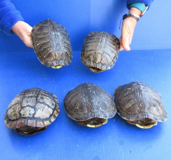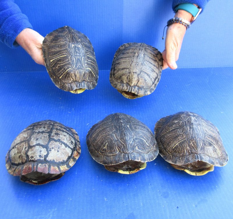 5 piece lot of Red Eared Slider Turtle Shells measuring approximately 7 to 7-1/2 inches long. - Review all photos. The red eared slider is a cold-blooded animal and will usually be found during the day sitting in the sun on a rock, log, or any stumps that are near the water. Some red eared sliders can even be found stacked up to three high, basking in the sun. While the red eared slider is very hard of hearing, they are sensitive to vibration and are very alert while they are basking. These vibrations allow the red eared slider the time to make their hasty retreat into the water if they feel threatened in any way. These are empty turtle shells from real turtles and will have natural imperfections from living and aging in nature.