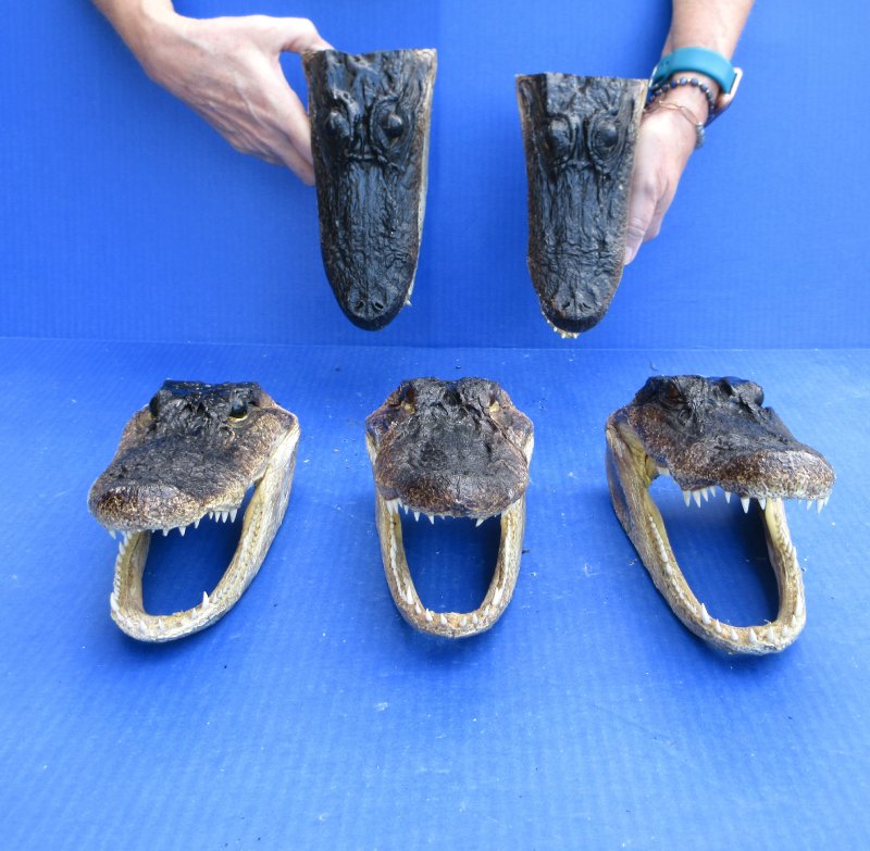 5 piece lot of taxidermy alligator heads. These alligator heads measure approximately 8 to 9 inches long. - Review all photos. These gator heads may have missing/broken teeth, scars, scrapes, cuts, etc. These are real alligators, from alligator farms and wild alligators, and will have imperfections due to fighting. These gator heads do not have felt backing - the open backs of the heads have been rough cut and painted BLACK. There might be an odor from the clear sealant used on these heads. The odor will subside over time. Alligators have between 74 and 80 teeth in their mouth at a time. As teeth wear down they are replaced. An alligator can go through 2,000 to 3,000 teeth in a lifetime. A taxidermy process cures the alligator skin and the alligator skull so it will be preserved for years.