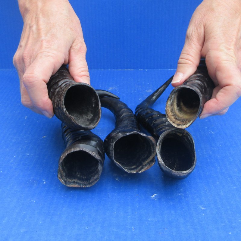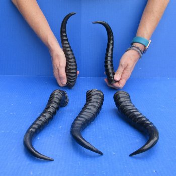 5 piece lot of polished male springbok horns from wild African Springbok, measuring approximately 10 to 13 inches long, around the curve of the horn using a cloth tape measure. - Review all photos. Springbok horns are used in making furniture, cane handles and in numerous taxidermy crafts. These are real polished springbok horns and they will have natural imperfections from living in the wild and using their horns for fighting, such as tiny chips and small splits at the mouth opening, tiny cuts, scars, blemishes, etc.