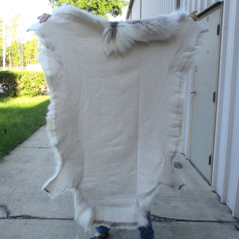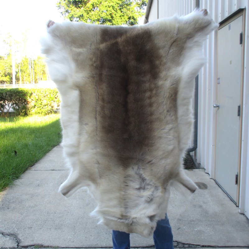 Reindeer skin, hide (Rangifer Tarandus) farm raised, imported from Finland measuring approximately 53 inches long by 44 inches wide. Review all photos. This reindeer pelt, reindeer hide or reindeer skin was harvested, cleaned and professionally tanned in Finland. Reindeer hides are a natural and comfortable product. Reindeer skins and reindeer pelts look great as wall decoration in a cabin or den, as furniture throws or decorative rugs but should not be walked or stepped on, to prevent shedding and breaking of the fur. Reindeer skins and hides should be cleaned once a year with a standard vacuum on the lowest power