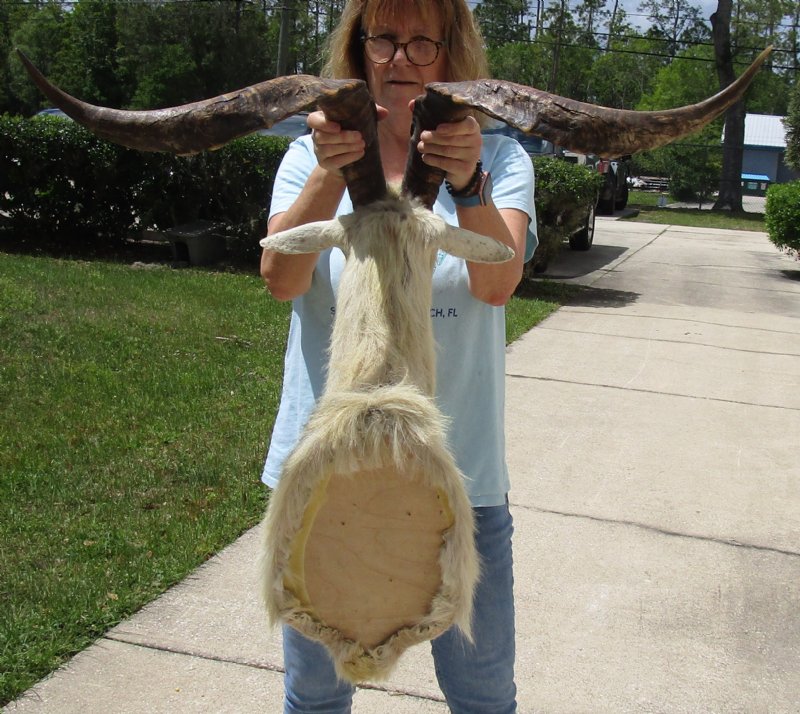 Goat Shoulder Mount for sale.   Bad spot on ear - review photos. Most goats naturally have two horns, their shape and size depending on the breed.  Unlike cattle, goats have not been successfully bred to be reliably polled, as the genes determining sex and those determining horns are closely linked.  Their horns are made of living bone surrounded by keratin and other proteins, and are used for defense, dominance, territoriality and thermoregulation. This Goat shoulder mount has be mounted by a professional taxidermist.