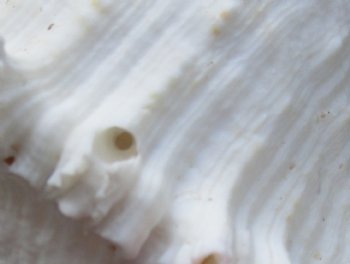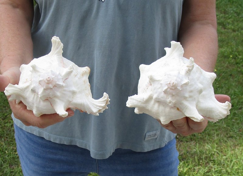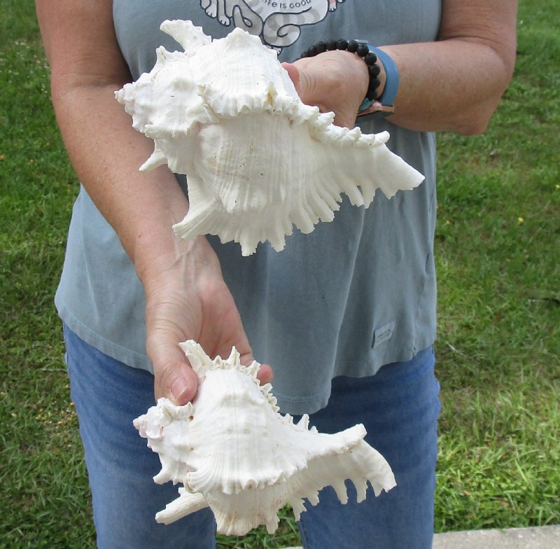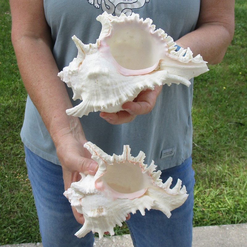 2 piece lot of Murex Ramosus (Chicoreus ramosus) for sale, also called Giant Murex shells, each measuring approximately 7 inches in size. Hole in one shell - Review photos. These giant murex shells are primarily white in color with patches of tan and some have an orange or pink color in the mouth of the shells. These are real shells - not replicas. They will have natural imperfections from living in the ocean and aging. There may be a tag "Made in the Philippines" on the shell. This a requirement of U.S. Customs. All products imported into the U.S. must have a country of origin tag. The tag is a "generic" tag used by our supplier.