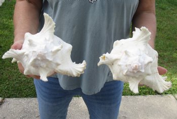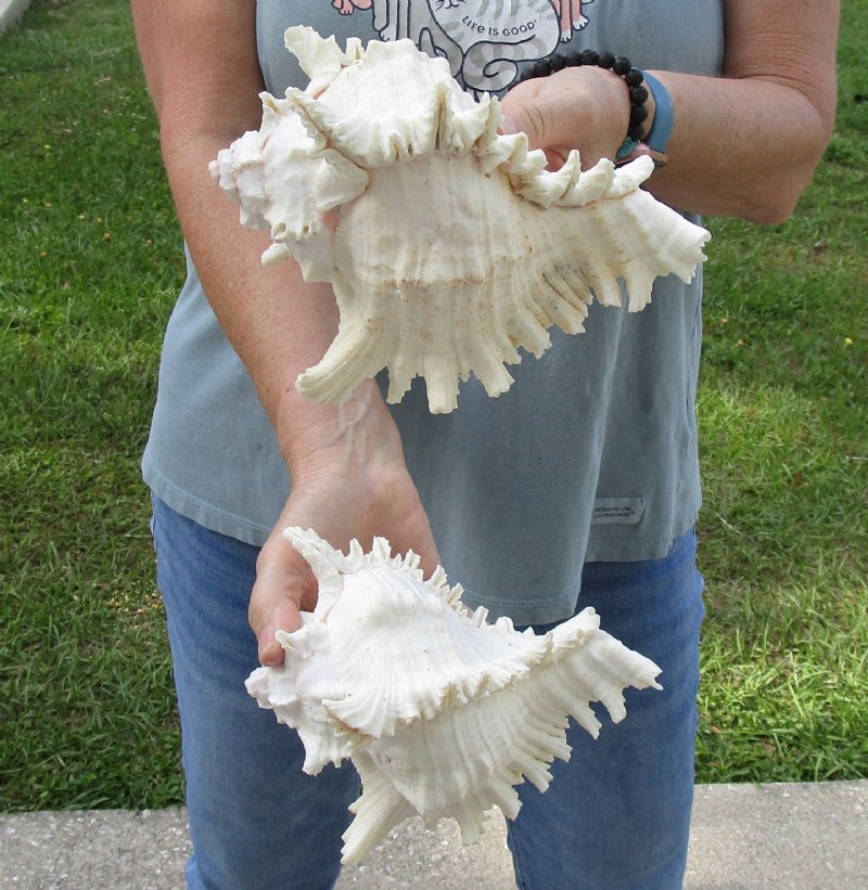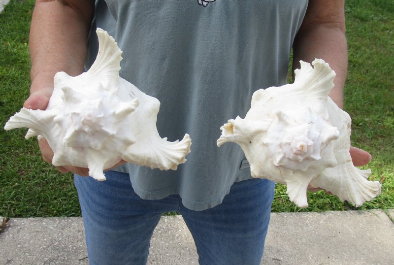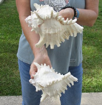 2 piece lot of Murex Ramosus (Chicoreus ramosus) for sale, also called Giant Murex shells, each measuring approximately 7 inches in size. Hole in one shell - Review photos. These giant murex shells are primarily white in color with patches of tan and some have an orange or pink color in the mouth of the shells. These are real shells - not replicas. They will have natural imperfections from living in the ocean and aging. There may be a tag "Made in the Philippines" on the shell. This a requirement of U.S. Customs. All products imported into the U.S. must have a country of origin tag. The tag is a "generic" tag used by our supplier.