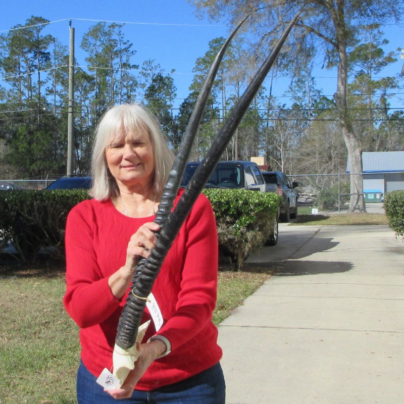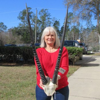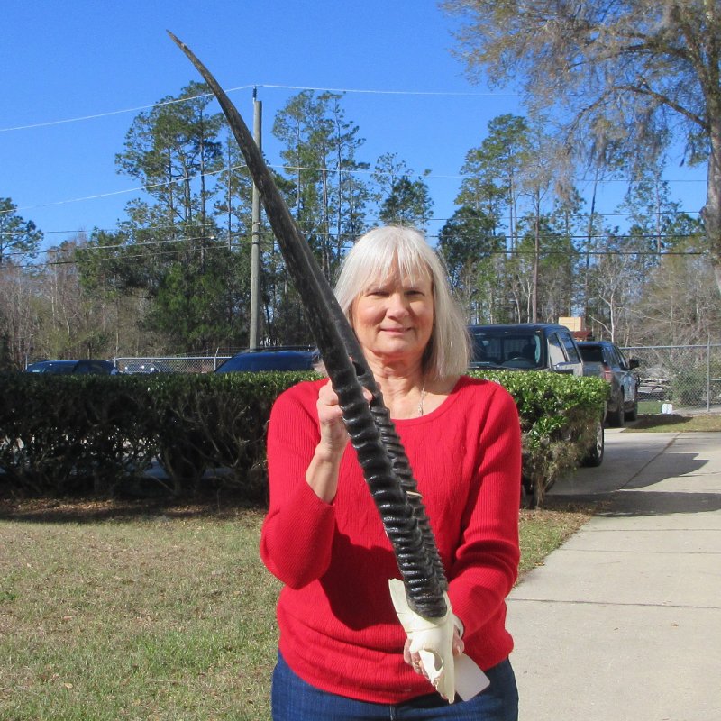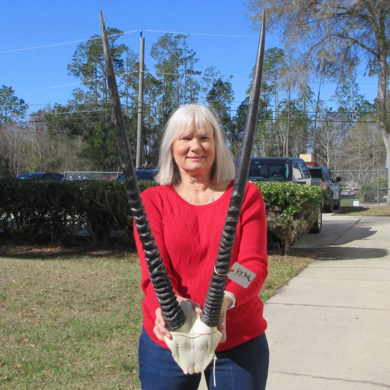 Gemsbok skull plate with 32 inch horns imported from South Africa.  -  Review all photos.  Gemsbok horns on gemsbok skull plates are perfect for rustic cabin decor and African themed decorating.  Our gemsbok horns on skull plates are from wild African gemsbok and will have imperfections normally found on all wild animal horns. We are direct importers of African animal horns. These gemsbok horns are a by-product of the African government's culling programs and the African farming industry. These horns have been cleared for legal entry into the U.S. by the U.S. Fish and Wildlife Service and U.S. Customs Department.