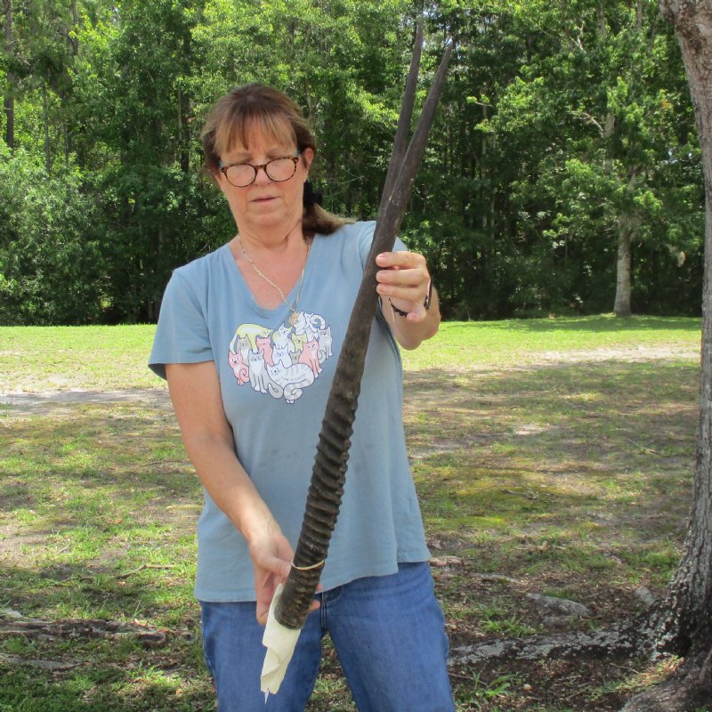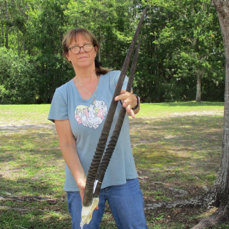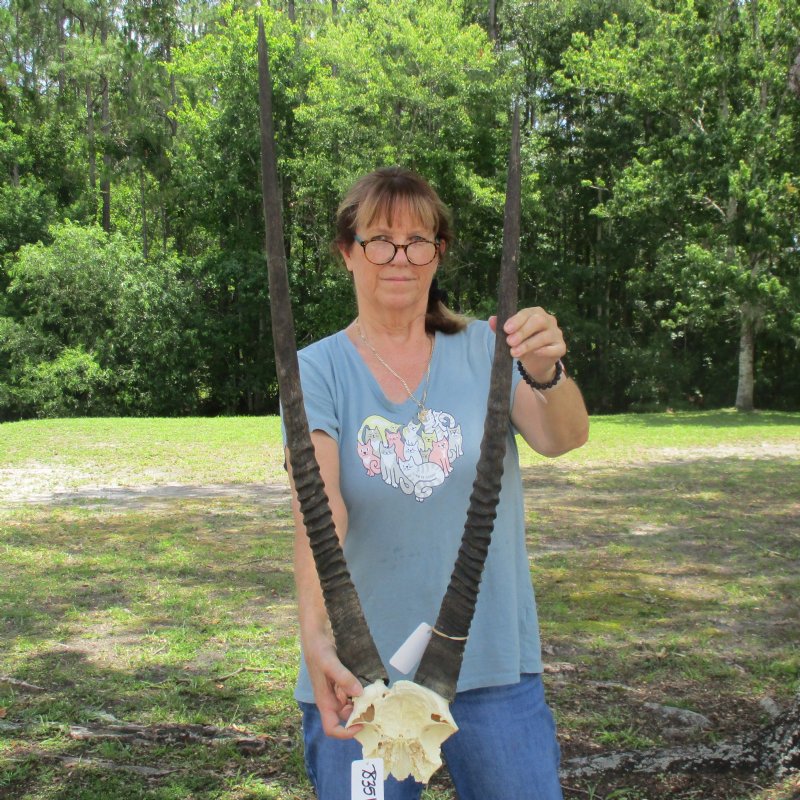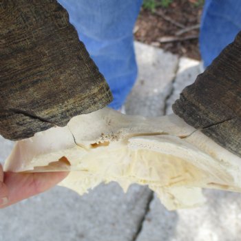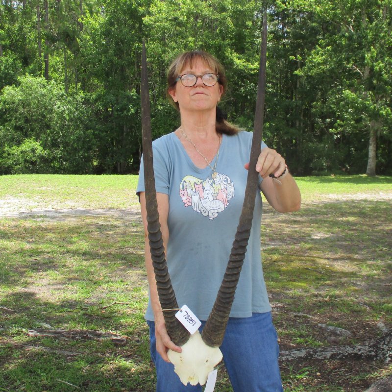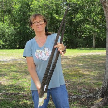 Gemsbok Skull Plate (Oryx gazella) for sale, with horns measuring approximately 33 & 37 inches long. - Review all photos. Our gemsbok horns on skull plates are from wild African gemsbok and will have imperfections normally found on all wild animal horns. We are direct importers of African animal horns. These gemsbok horns are a by-product of the African government's culling programs and the African farming industry. These horns have been cleared for legal entry into the U.S. by the U.S. Fish and Wildlife Service and U.S. Customs Department.