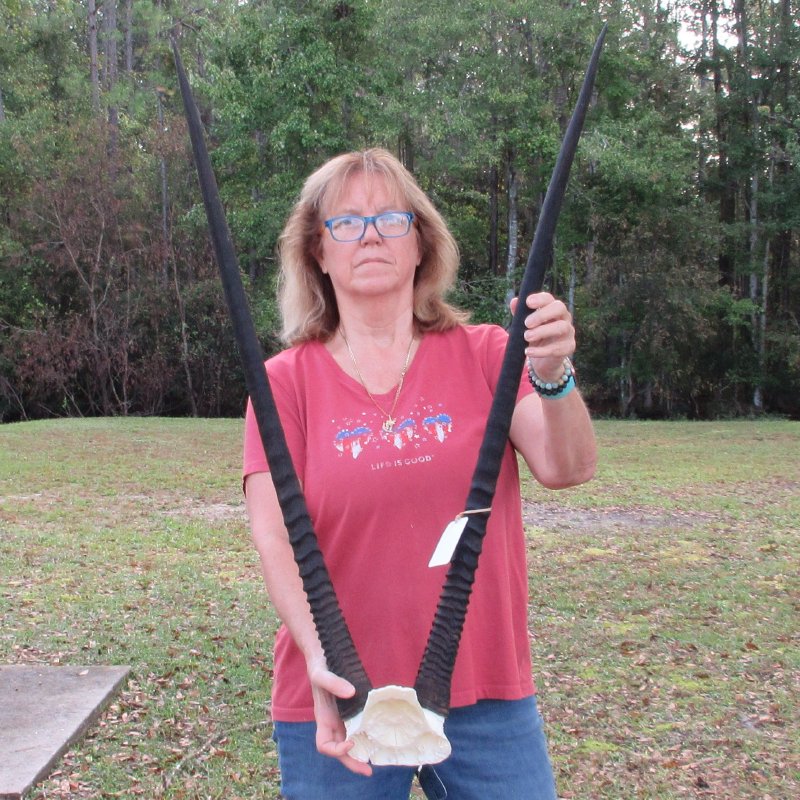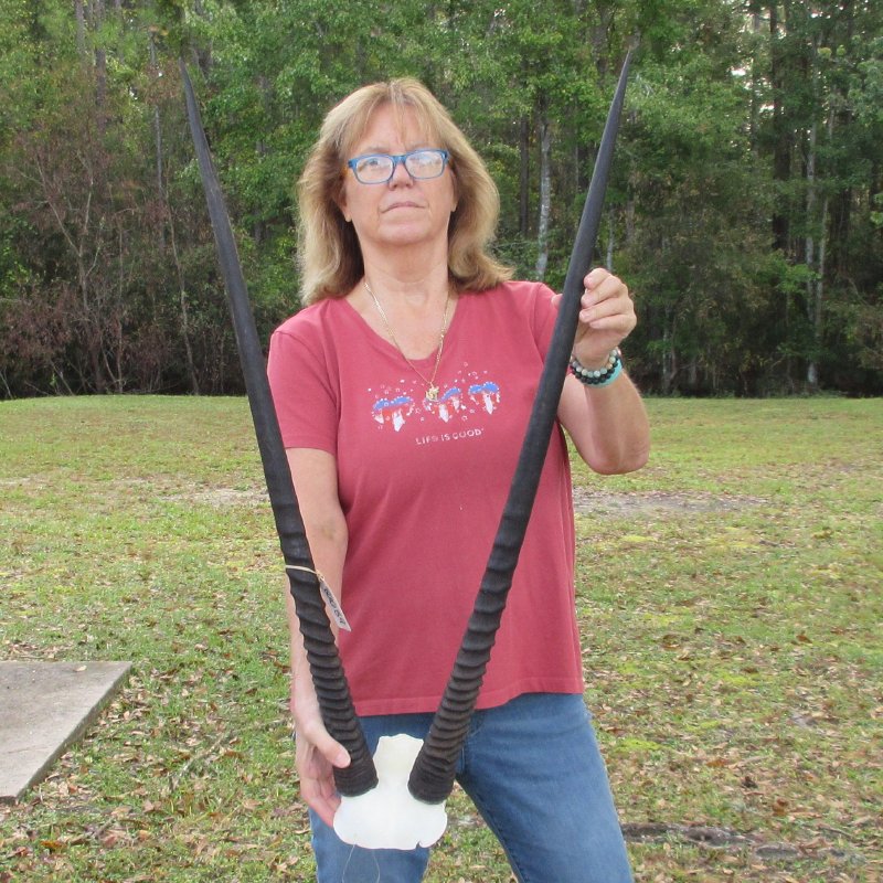 Gemsbok skull plate with 36-1/2 inch horns imported from South Africa.  - Review all photos.  Gemsbok horns on gemsbok skull plates are perfect for rustic cabin decor and African themed decorating.  Our gemsbok horns on skull plates are from wild African gemsbok and will have imperfections normally found on all wild animal horns. We are direct importers of African animal horns. These gemsbok horns are a by-product of the African government's culling programs and the African farming industry. These horns have been cleared for legal entry into the U.S. by the U.S. Fish and Wildlife Service and U.S. Customs Department.