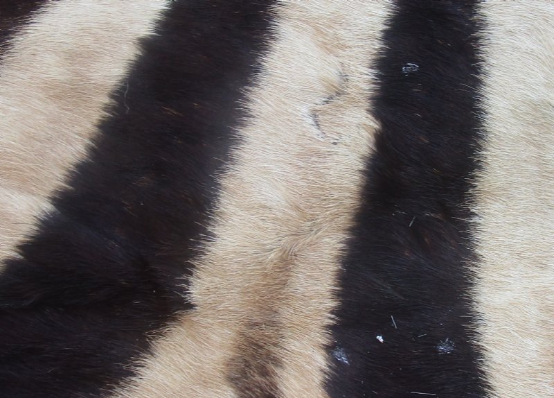 B-Grade Real African zebra skin (Equus burchelli) rug for sale, zebra skin area rug imported from South Africa. This is a real African zebra skin area rug lined with a black felt backing and measures approximately 72 inches long from base of the tail to the nose by 60 inches wide measured at widest point on back legs.  All zebra skins will have small imperfections from the zebra living in the wild. These skins may have patches, bald spots, repair stitching, and other small imperfections - review photos. Our real zebra skin area rugs are professionally tanned in South Africa. This zebra skin was harvested in accordance with the African government's culling program.