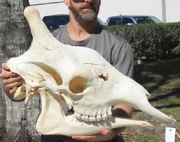 We carry African giraffe skulls, hand picked and photographed so you can see exactly what you are buying. We have full giraffe skulls which include the top and bottom jaw and also carry giraffe top skulls, without the bottom jaw. Giraffes live primarily in savanna areas in the sub-Saharan region of Africa. Their extreme height allows them to eat leaves and shoots located much higher than other animals can reach. In particular, they seek out acacia trees. Their long tongues are helpful in eating because they help pull leaves from the trees. Spending most of the day eating, a full-grown giraffe consumes over 100 pounds of leaves and twigs a day.