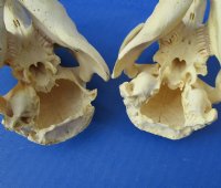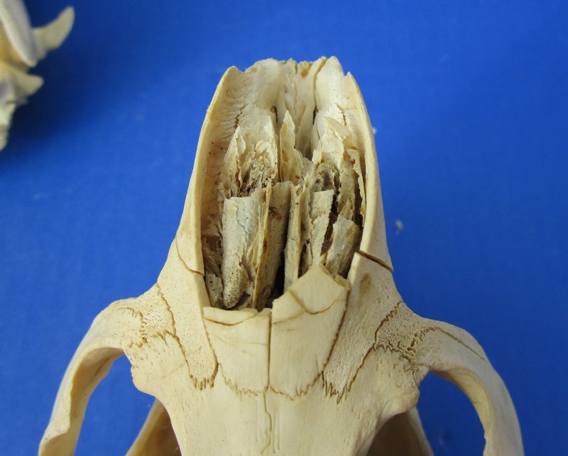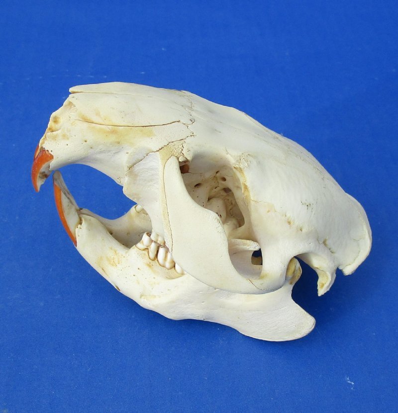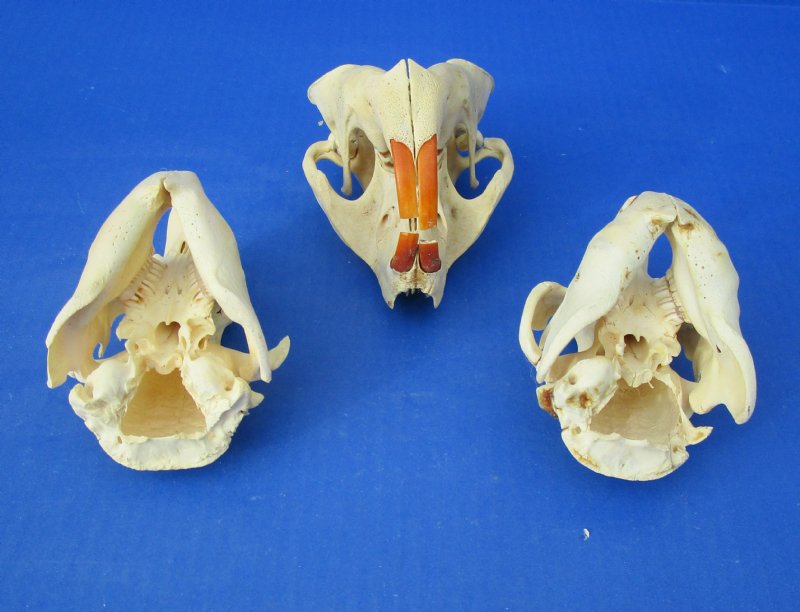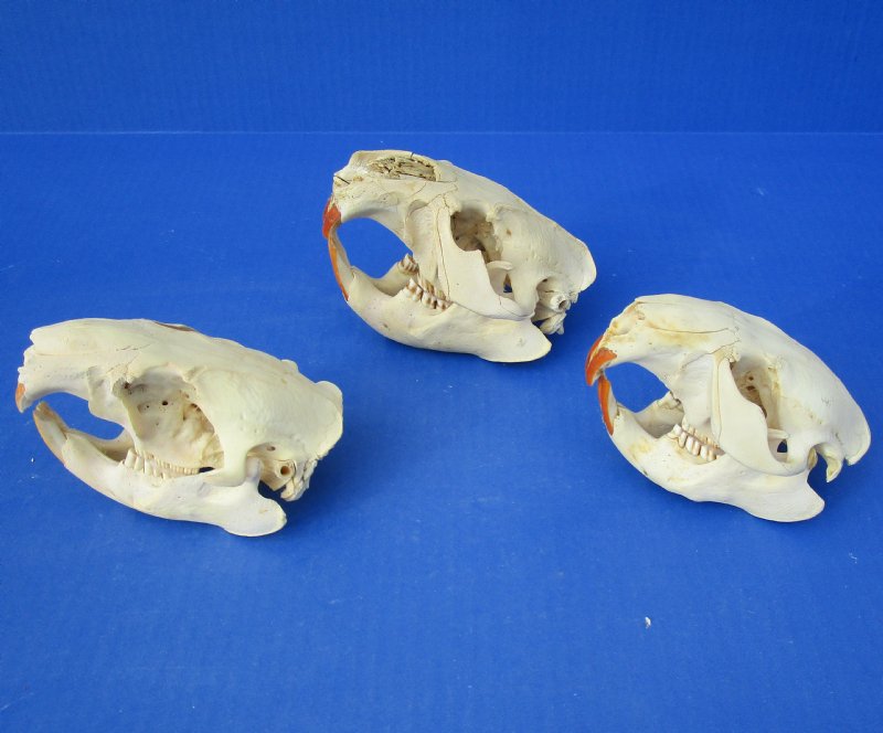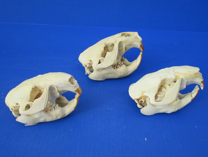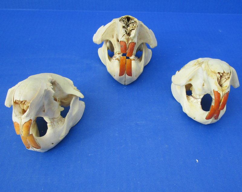 Grade B Cheap North American beaver skulls wholesale measuring between approximately 4-1/2 inches and 5-1/2 inches long. (Some of these beaver skulls have been glued shut with hot melt glue - the glue is on the teeth) - These are Grade B skulls and will have some type of imperfections such as, broken nose, minor discoloration, damaged eye sockets and damage to back of skull - review photos. Our beaver skulls have been cleaned and are ready for display; however, some may be off-white in color and have small patches of discoloration.  These skulls are from wild beaver and are commercial grade and imperfect. They may have imperfections due to the natural aging process and living in the wild--scars, blemishes, rub areas, broken teeth, missing teeth, bug bite marks, etc.