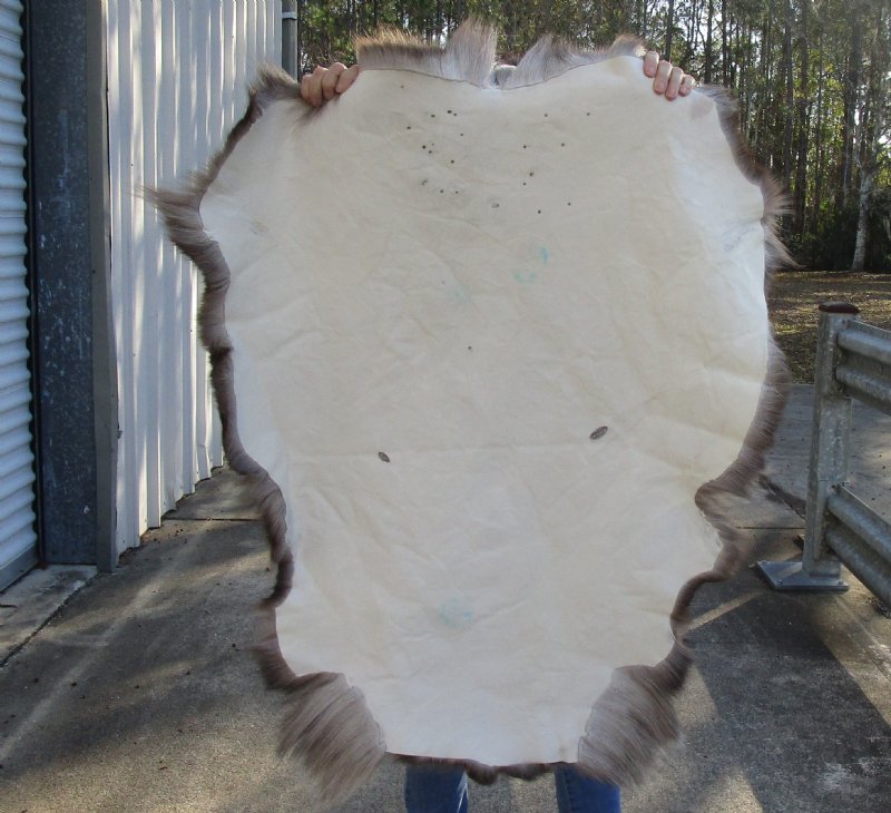 Grade B Reindeer hide, reindeer skin without legs imported from Finland, farm raised for food.  This hide measures approximately 43 inches long and 31 inches wide.  Cut/scratch marks and holes - Review all photos. This reindeer fur without legs is professionally tanned and imported from Finland.  The legs have been trimmed off. This reindeer hide without legs is a natural and comfortable product and looks great as a wall decoration in a cabin or den, as furniture throws or decorative rugs but should not be walked or stepped on, to prevent shedding and breaking of the fur.  Reindeer skins and hides should be cleaned once a year with a standard vacuum on the lowest power.